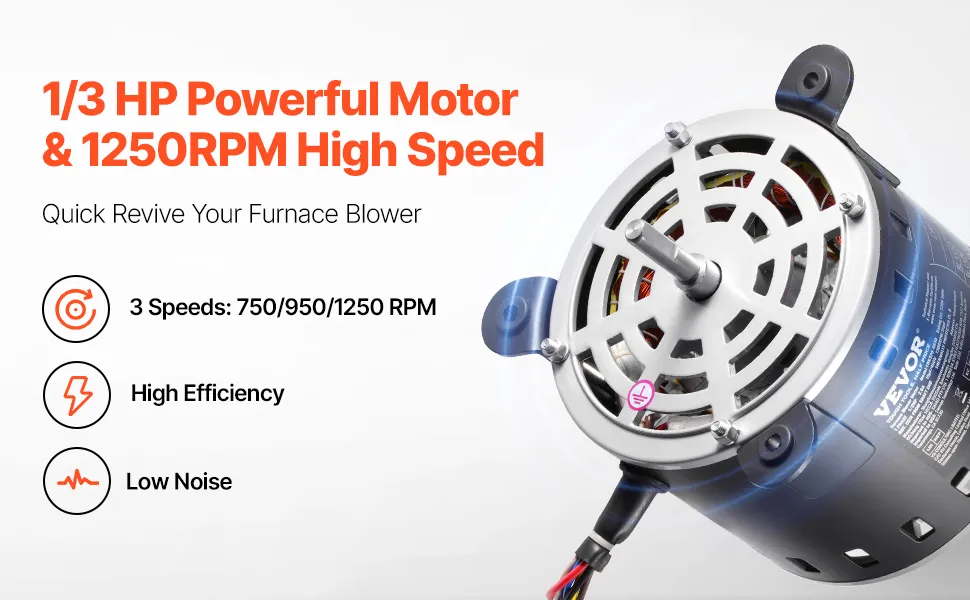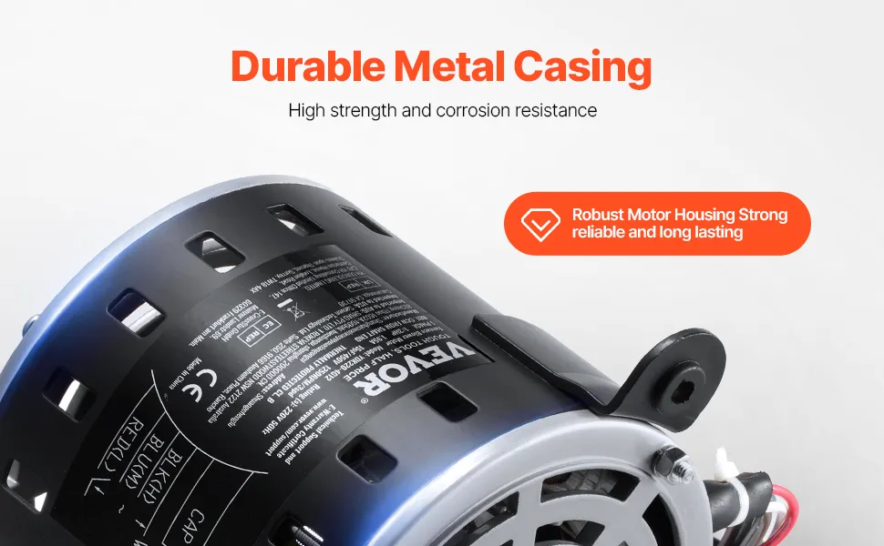 Silnik dmuchawy VEVOR o mocy 1/3 KM (3 prędkości: 1250, 950 i 750 obr./min) pracuje pod napięciem 220 V i prądem 1,95 A. Dzięki wałowi o długości 20 mm, średnicy 10 mm, kierunkowi CZERWONY/POD WŁÓKNA CCW od końca wału oraz kondensatorowi CBB60 15 μF/450 V, jest idealnym wyborem do systemów kanałów klimatyzacyjnych i pieców.