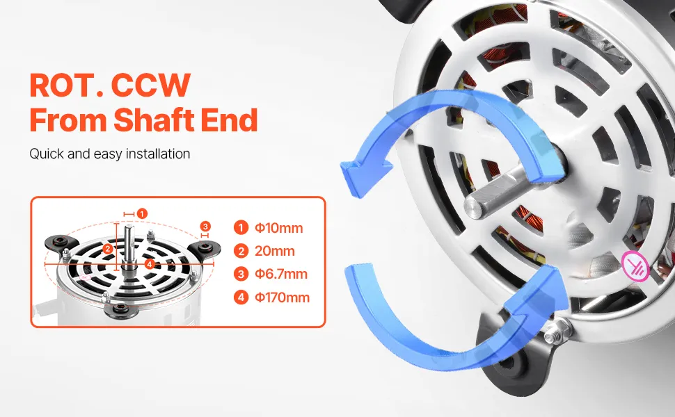 Łatwa instalacja: Ten silnik dmuchawy pieca ma średnicę wału 10 mm (0,39 cala), długość wału 20 mm (0,78 cala) i średnicę montażową Φ170 mm. Zaprojektowany z RED i CCW od końca wału, upraszcza okablowanie i umożliwia szybkie podłączenie.