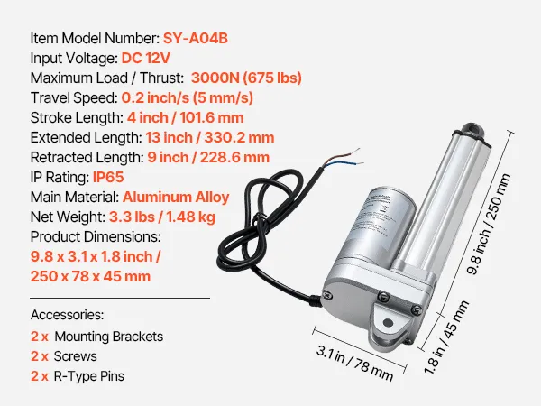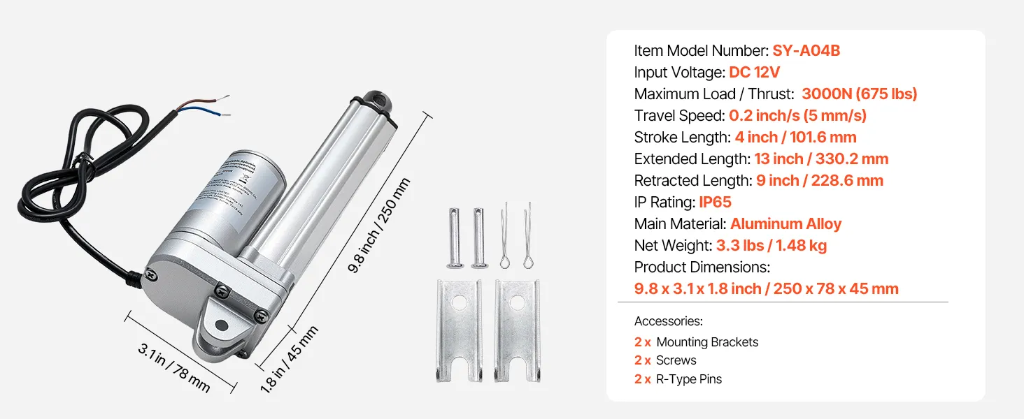 Siłownik liniowy VEVOR 12 V, silnik liniowy wodoodporny IP65 101,6 mm, siłownik liniowy 3000 N, siłowniki liniowe 5 mm/s z uchwytami montażowymi do trackerów słonecznych, maszyn przemysłowych, otwieraczy drzwi