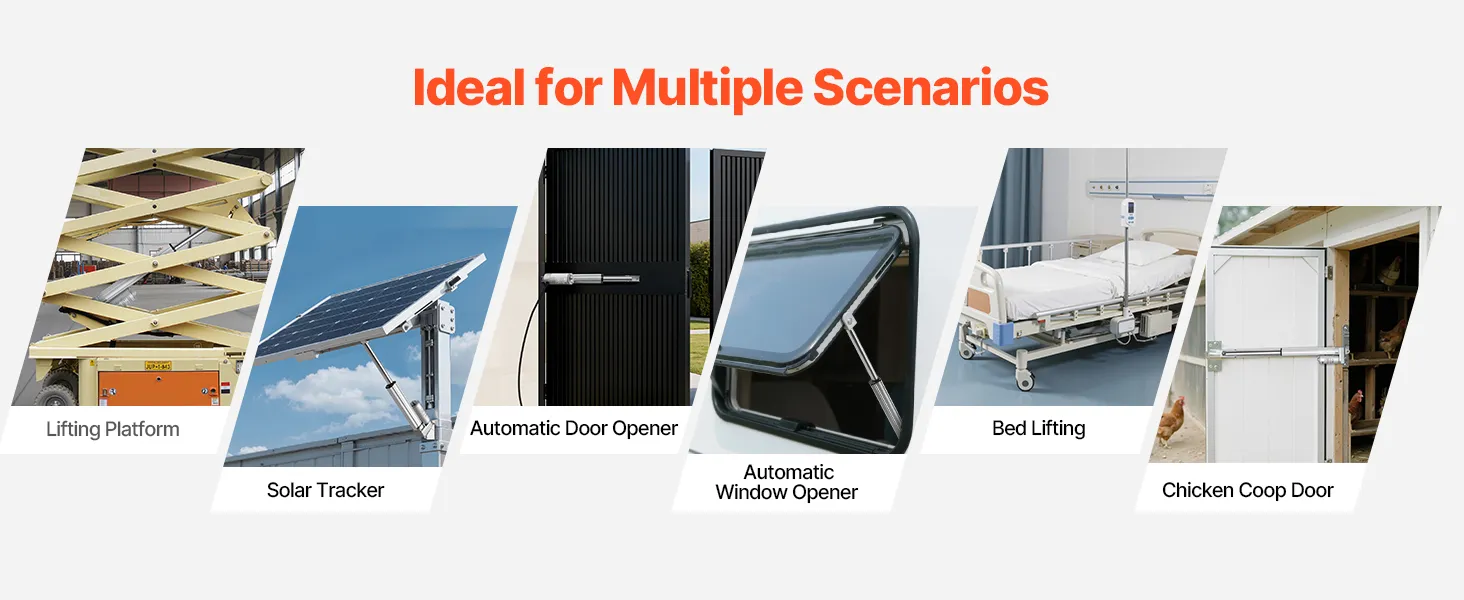 Napęd liniowy VEVOR 12 V zapewnia dużą siłę podnoszenia w pionie i poziomą siłę ciągu wynoszącą 300 kg. Nadaje się do różnych zastosowań wymagających średnich obciążeń, takich jak systemy śledzenia paneli słonecznych, systemy nawadniające, urządzenia mechaniczne lub kosiarki do trawy.