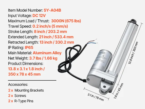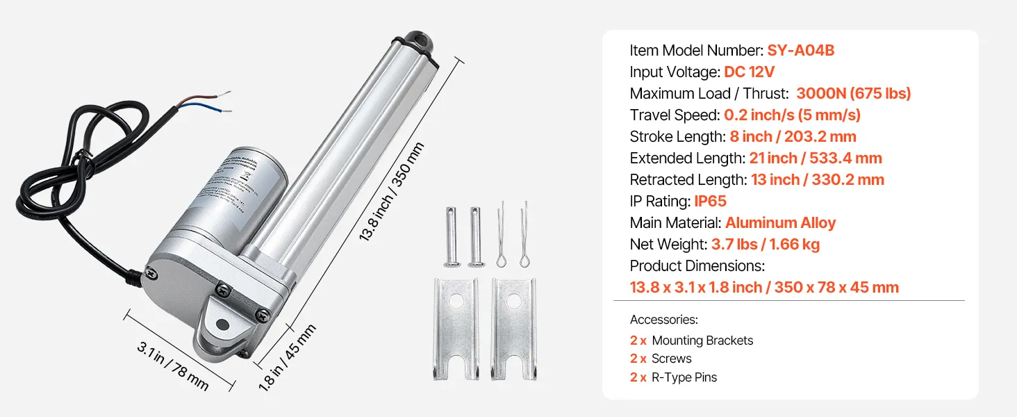 Siłownik liniowy VEVOR 12 V, silnik liniowy wodoodporny IP65 o długości 203,2 mm, siłownik liniowy 3000 N, siłowniki liniowe 5 mm/s z uchwytami montażowymi do trackerów słonecznych, maszyn przemysłowych, otwieraczy drzwi