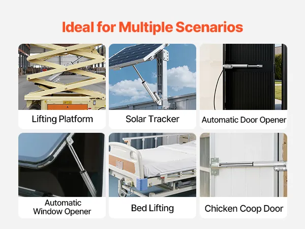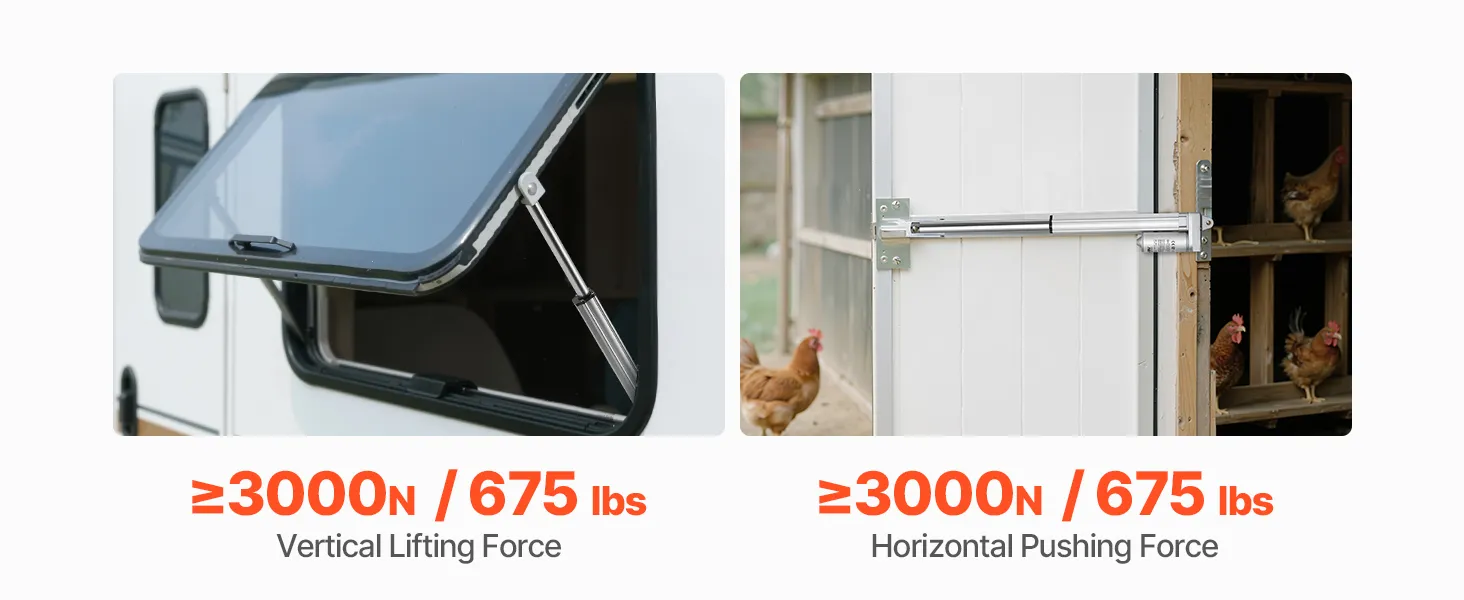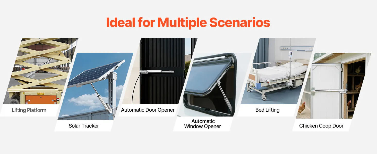 Napęd liniowy VEVOR 12V zapewnia dużą siłę podnoszenia w pionie i poziomą siłę ciągu wynoszącą 300 kg i jest przeznaczony do różnych zastosowań wymagających średnich obciążeń, takich jak systemy śledzenia paneli słonecznych, systemy nawadniające, urządzenia mechaniczne lub kosiarki do trawy.