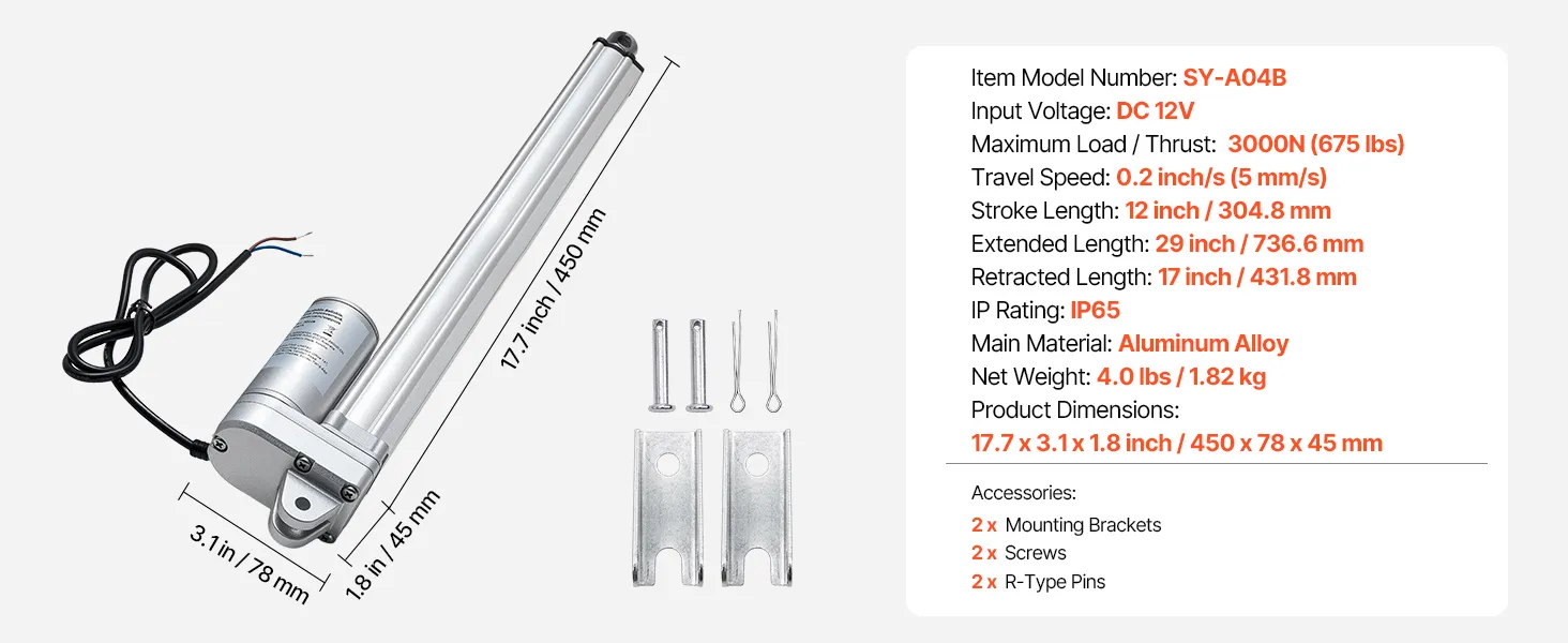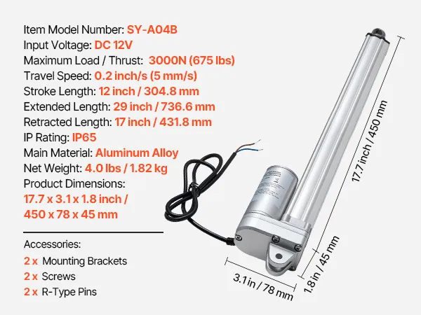 Siłownik liniowy VEVOR 12 V, siłowniki liniowe 304,8 mm, wodoszczelność IP65, siłownik liniowy 3000 N, napędy ruchu 5 mm/s z uchwytem montażowym do trackerów słonecznych, maszyn przemysłowych, otwieraczy drzwi