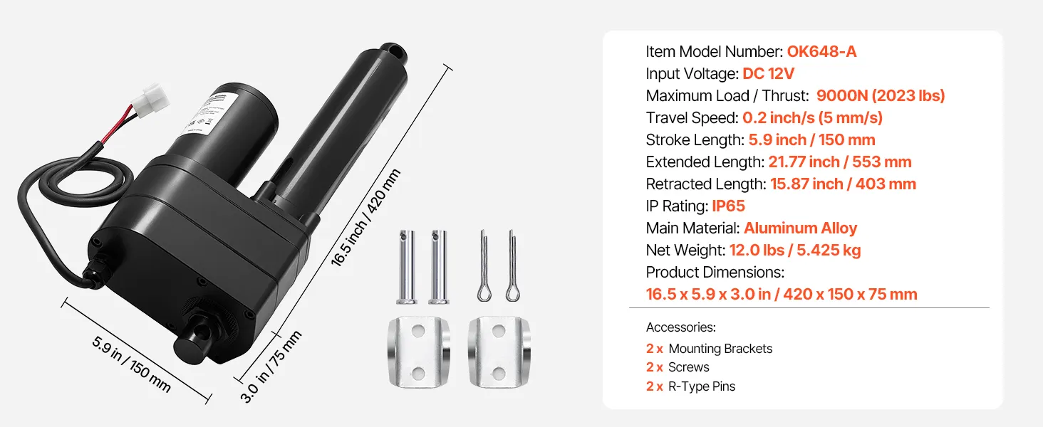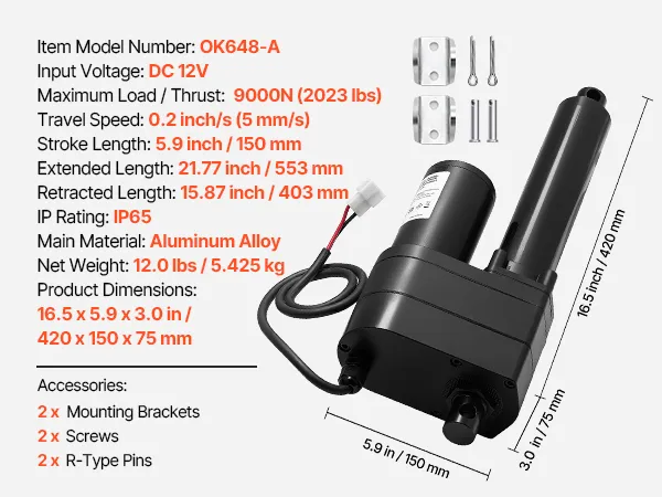 Siłownik liniowy VEVOR 12V, skok 150 mm, 9000 N, wodoodporny IP65, 5 mm/s, siłowniki liniowe z uchwytami montażowymi do przemysłowych kontenerów maszynowych, systemów podnoszenia ciężarów