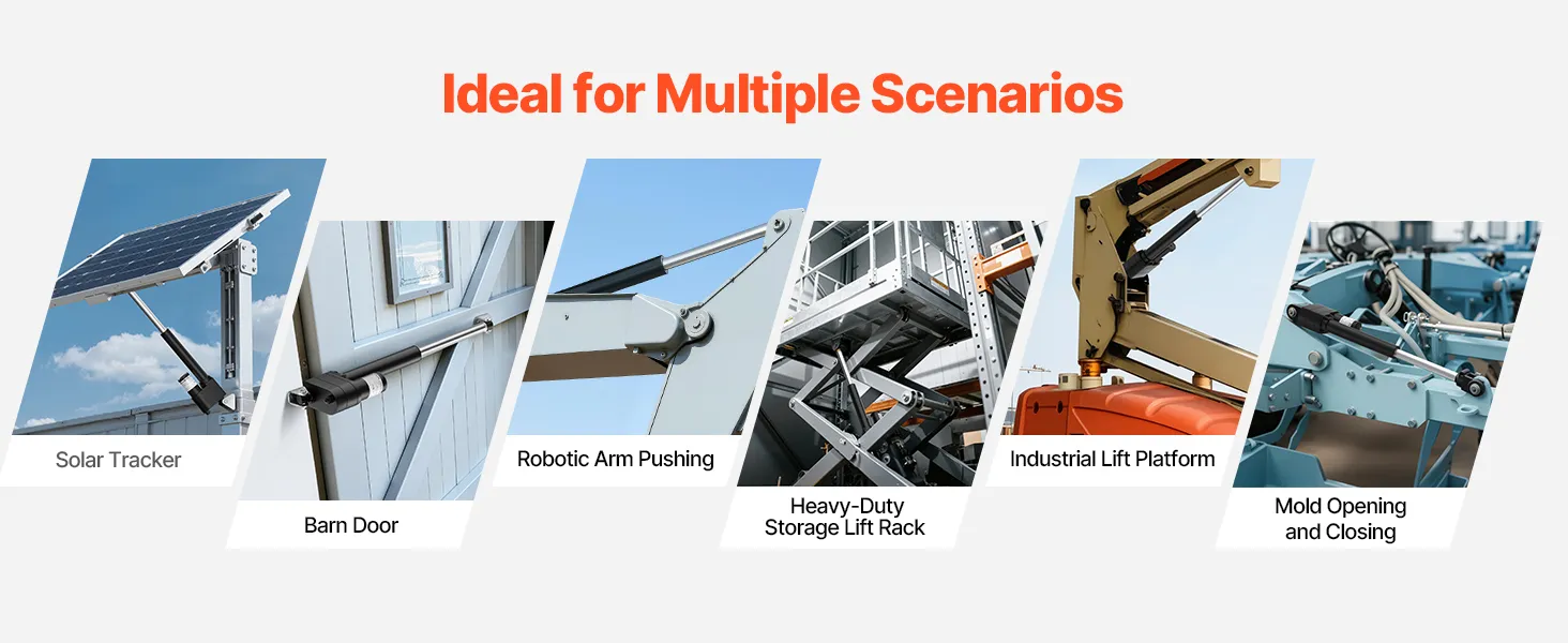Wszechstronne zastosowania: Ten wysokowydajny siłownik liniowy działa poniżej 65 dB i idealnie nadaje się do bram przesuwnych, napędów ciężkich ramion robotów, ciężkich maszyn, statków, systemów transportowych, platform podnoszących, systemów automatyki przemysłowej i innych zastosowań o dużym obciążeniu.