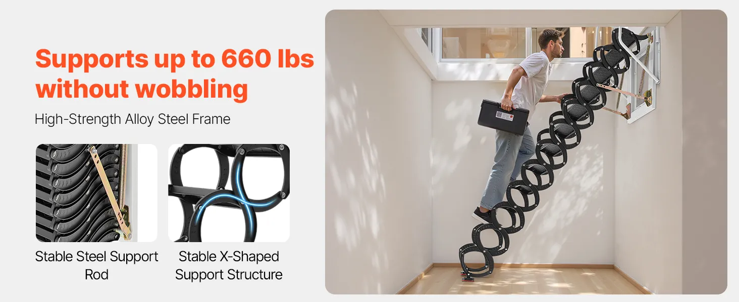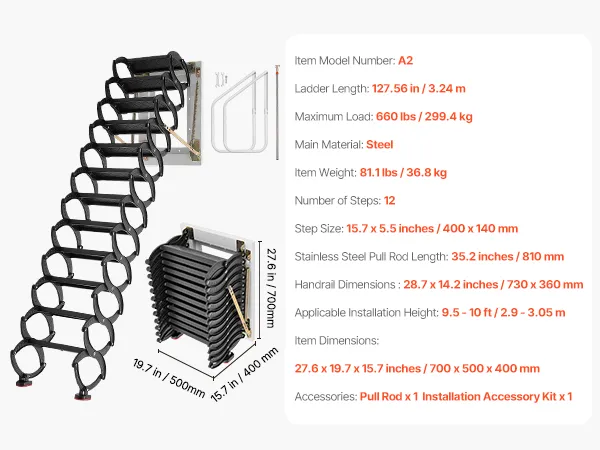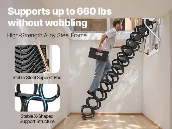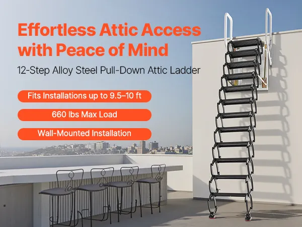 Ta drabina, wykonana z wysokowytrzymałej stali stopowej z solidną ramą X i drążkami podporowymi, wytrzymuje do 299,4 kg. Stopnie o szerokości 14 cm ułatwiają wspinanie się, a dołączony drążek do ciągnięcia zapewnia bezwysiłkową obsługę.