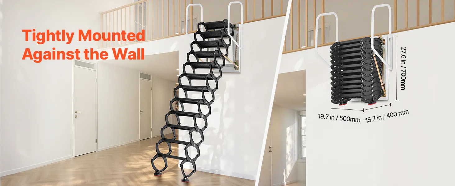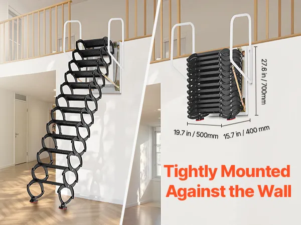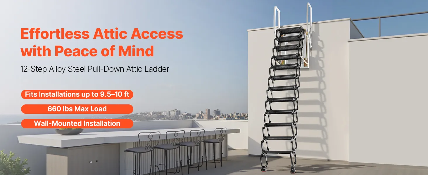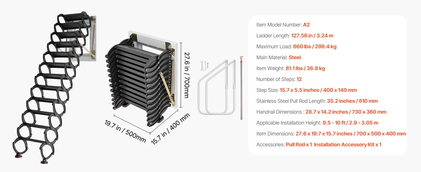 Drabina VEVOR montowana na ścianie, udźwig 299,4 kg, pasuje do sufitów o wysokości od 2,9 do 3,05 m, 12-stopniowe, stalowe, chowane schody z poręczami, do strychów, garaży, dachów i piwnic