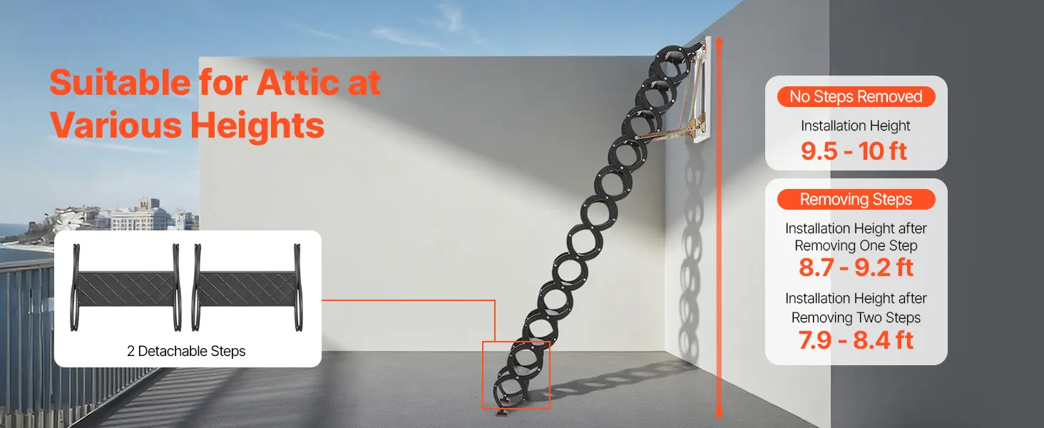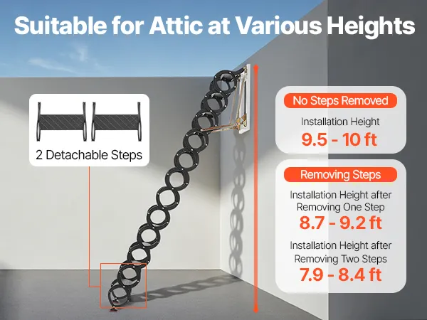 Ta rozkładana, montowana na ścianie drabina strychowa ma dwa wyjmowane stopnie i oferuje trzy wysokości montażu: 2,8–3,0 m, 2,6–2,8 m i 2,4–2,6 m. W zestawie znajdują się szczegółowe instrukcje ułatwiające montaż.