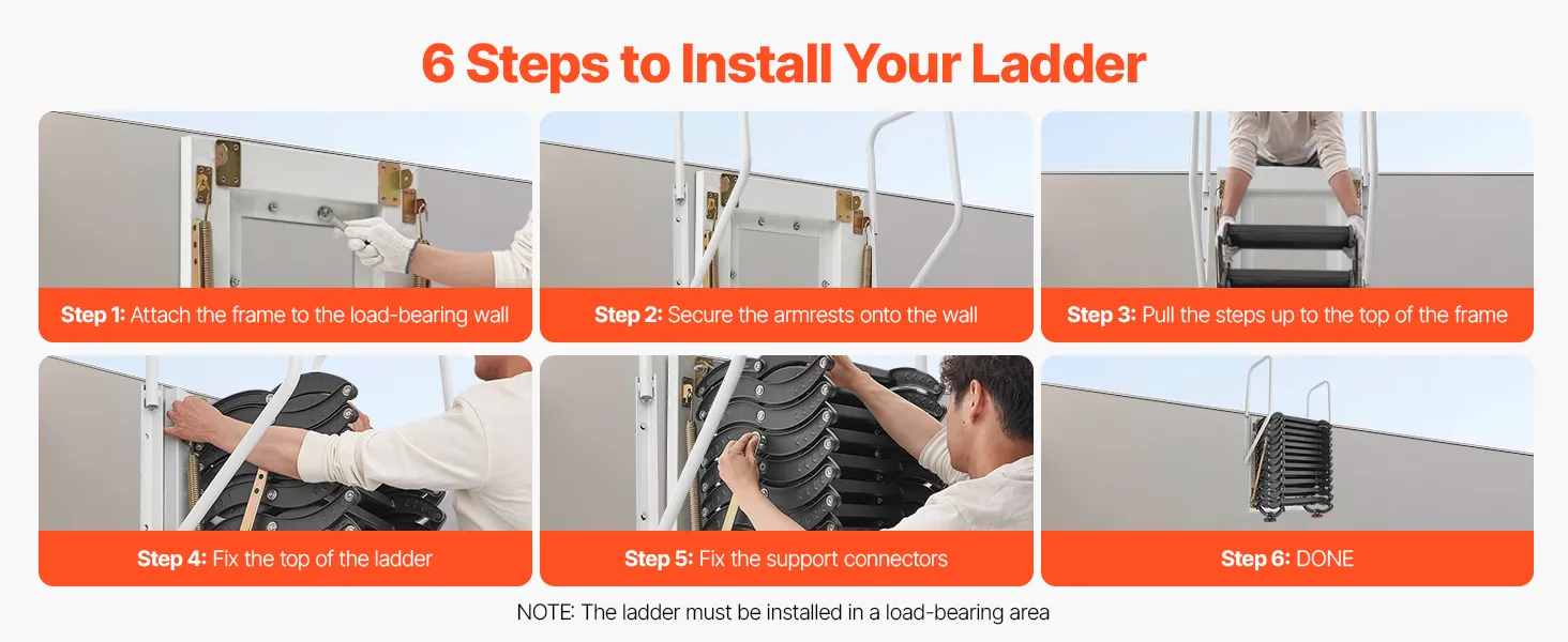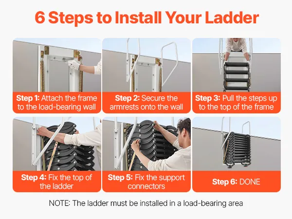 Montaż na ścianie: Obsługuje trzy wysokości poprzez usunięcie dwóch ostatnich stopni. Montaż na równi ze ścianą bez szczelin. Nie wymaga cięcia – po prostu przymocuj ramę, poręcze i drabinę za pomocą śrub, a następnie połącz górę ze wspornikami zgodnie z instrukcją.
