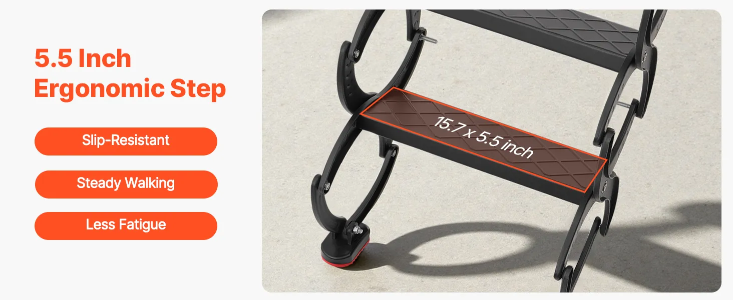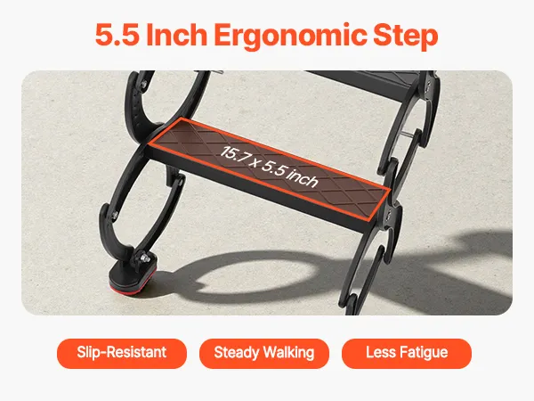 Nośność 299,4 kg: Wykonana z wytrzymałej, odpornej na uderzenia i zużycie stali, w połączeniu z solidnymi zawiasami i prętami podporowymi dla długotrwałej wydajności. Rama w kształcie litery X zwiększa ogólną stabilność. Antypoślizgowe gumowe nóżki zapobiegają poślizgom, umożliwiając pracę na drabinie wielu dorosłym osobom.