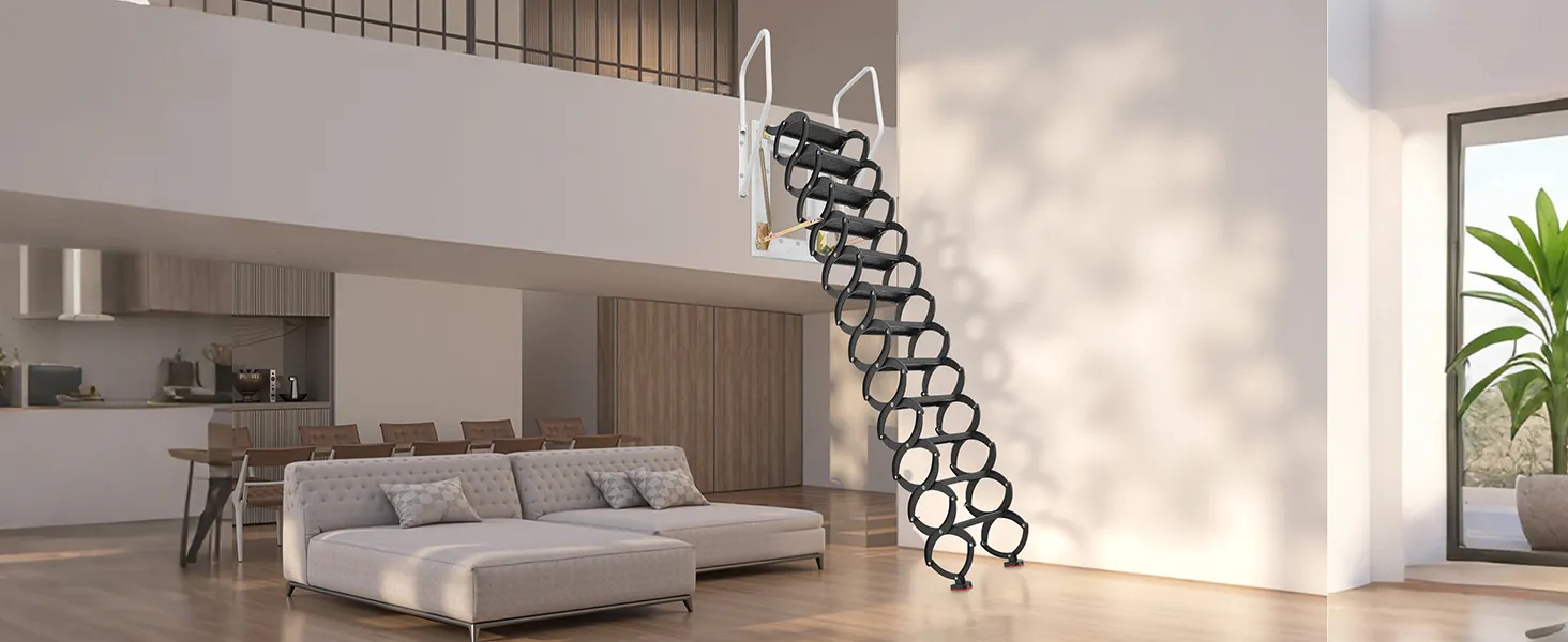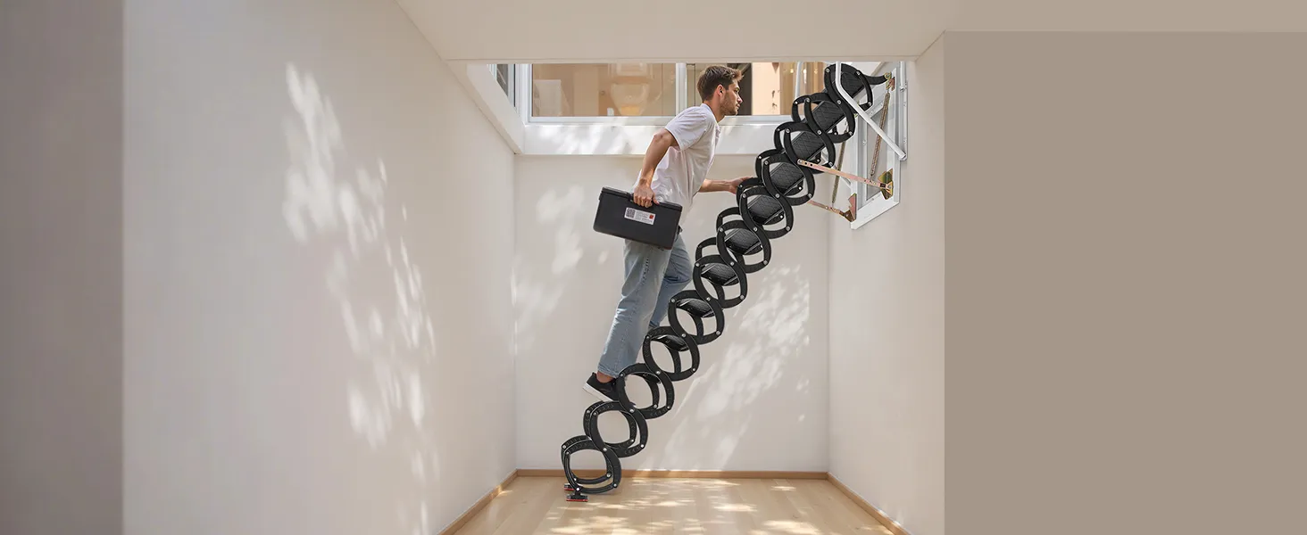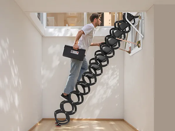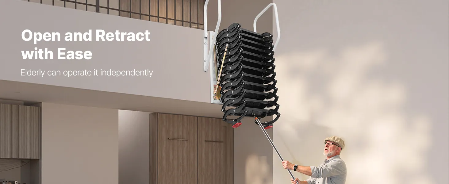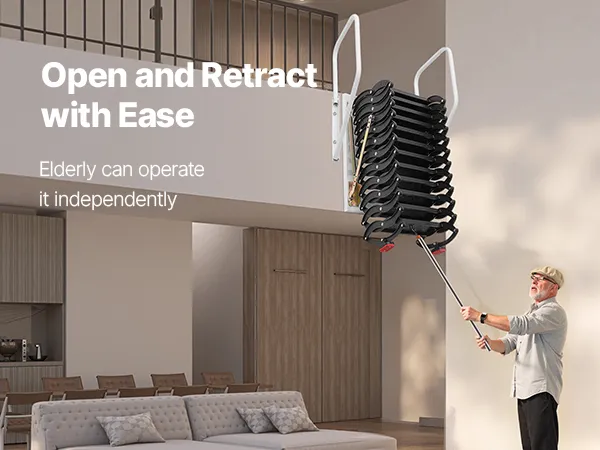 Łatwe otwieranie i zamykanie: drabina jest wyposażona w drążek, co umożliwia łatwy dostęp bez wspinania się lub dodatkowych narzędzi. Wystarczy pociągnąć, aby otworzyć i użyć drążka, aby złożyć — idealne do częstego użytkowania.