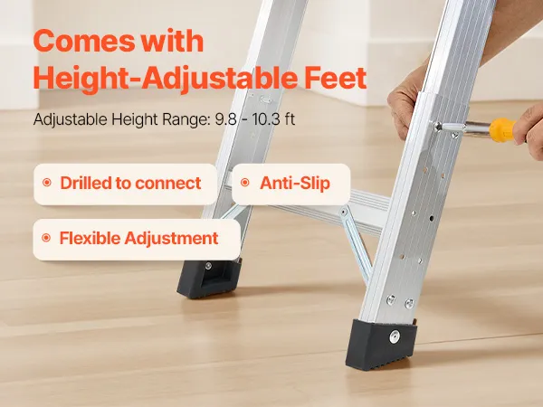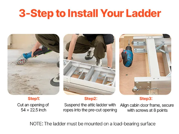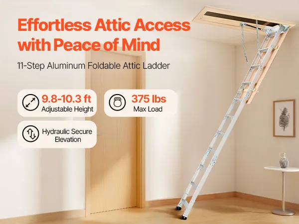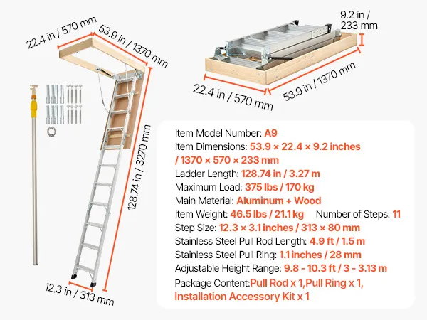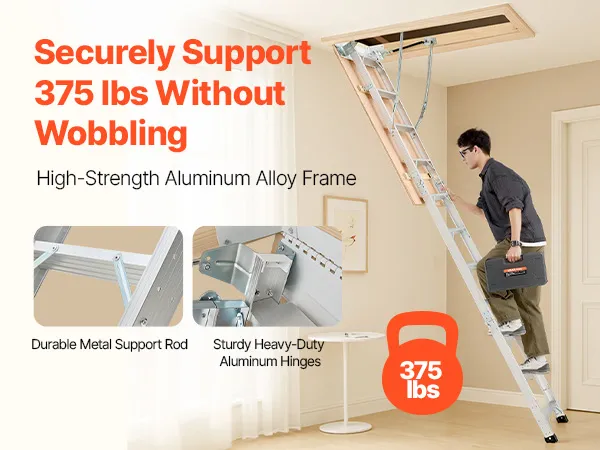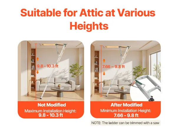 Z regulowanymi nóżkami podporowymi chroniącymi podłogę, otworem o wymiarach 137 x 57 cm i dwoma opcjami wysokości (3,9–3,1 m / 2,3–3,1 m) ta drabina nadaje się do różnych przestrzeni. Montaż wymaga zaledwie trzech kroków. W zestawie znajdują się szczegółowe instrukcje.
