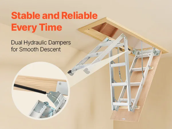 Hydrauliczne wspomaganie płynnego opuszczania: Ulepszone hydrauliczne drążki po obu stronach umożliwiają powolne i płynne otwieranie drabiny strychowej. Zapobiega to nagłemu opuszczaniu i zapewnia niezawodne użytkowanie dla Twojej rodziny. Zmniejsza to również wysiłek wymagany do otwierania i zamykania drabiny, co czyni ją idealną dla osób starszych lub o ograniczonej sile.