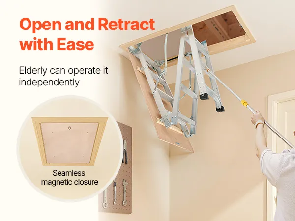 Łatwe otwieranie i zamykanie: Ten rozsuwany system drabin strychowych jest wyposażony w drążek i pierścień, co eliminuje potrzebę wspinania się lub kupowania dodatkowego sprzętu. Po prostu delikatnie pociągnij, aby otworzyć i użyj drążka, aby złożyć. Magnetyczny panel drzwi zapewnia bezpieczne zamknięcie i idealnie pasuje do projektu Twojego sufitu.