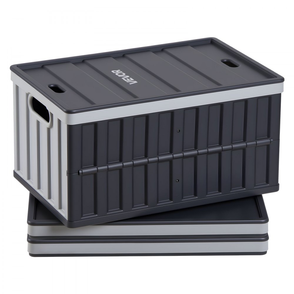 VEVOR Składane pojemniki do przechowywania 65 l, 3 sztuki, składane plastikowe pojemniki do przechowywania, składane kosze do układania w stosy z pokrywkami, ładowność 38 kg na pojemnik, składane skrzynie, idealne do organizacji gospodarstwa domowego, szare i czarne