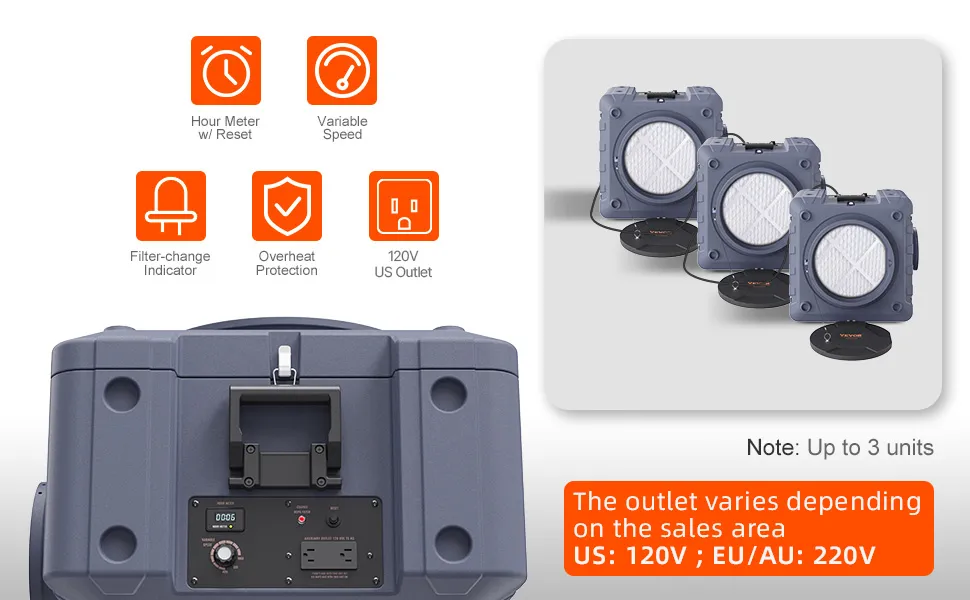Plug and play: Nie wymaga montażu; wystarczy podłączyć i gotowe do użycia. Na panelu sterowania znajdują się dwa gniazda pomocnicze, co pozwala na szeregowe połączenie do trzech urządzeń o łącznym przepływie powietrza 1650 CFM. Dzięki temu urządzenie idealnie nadaje się do intensywnych prac remontowych w wielu pomieszczeniach.