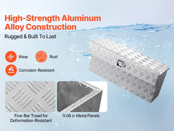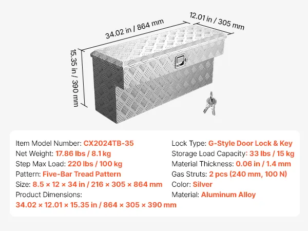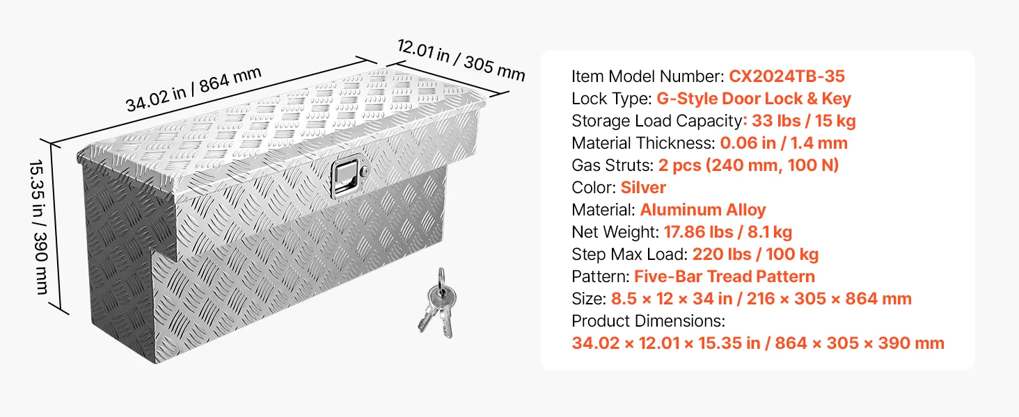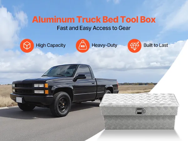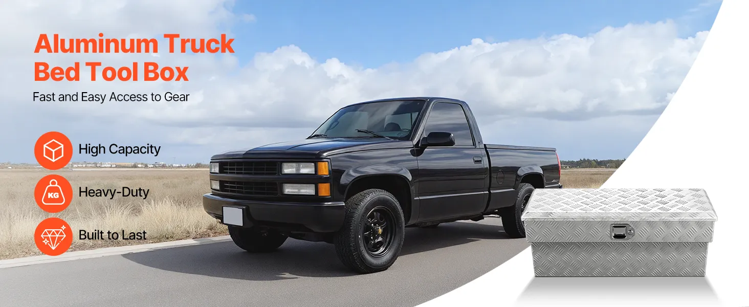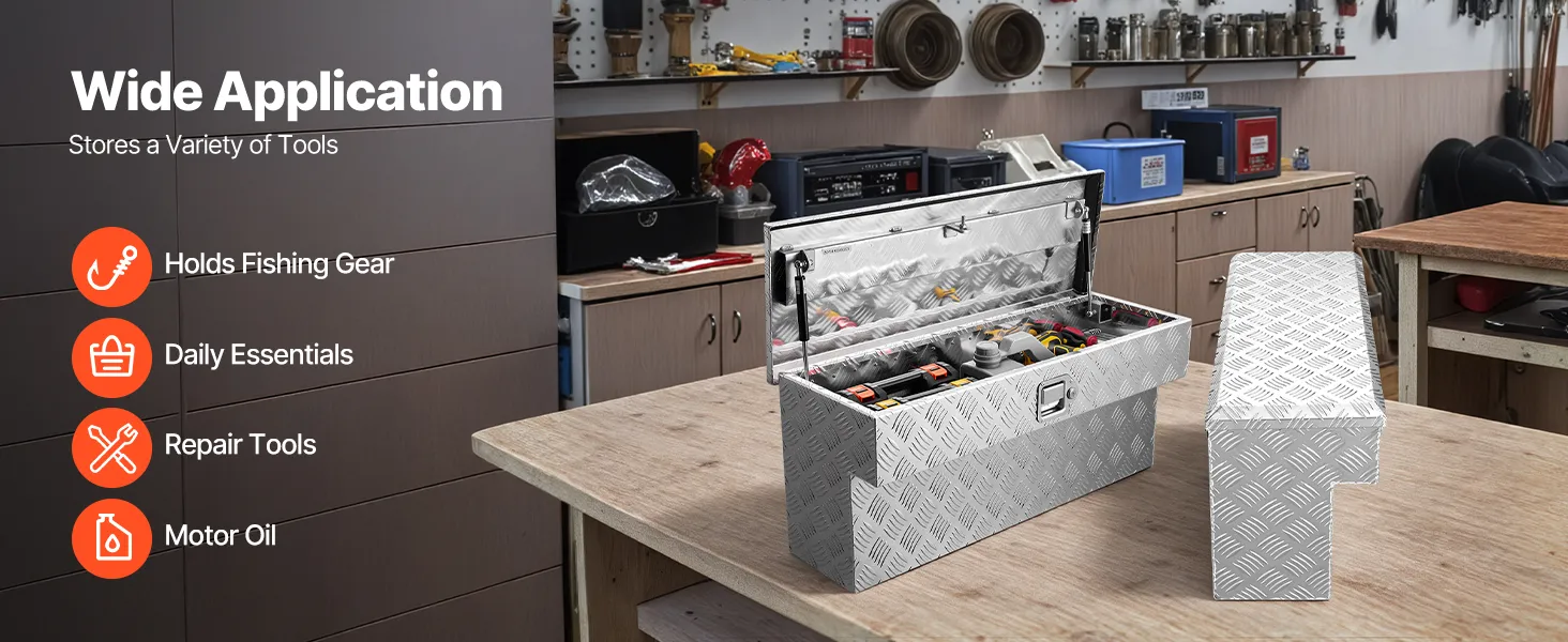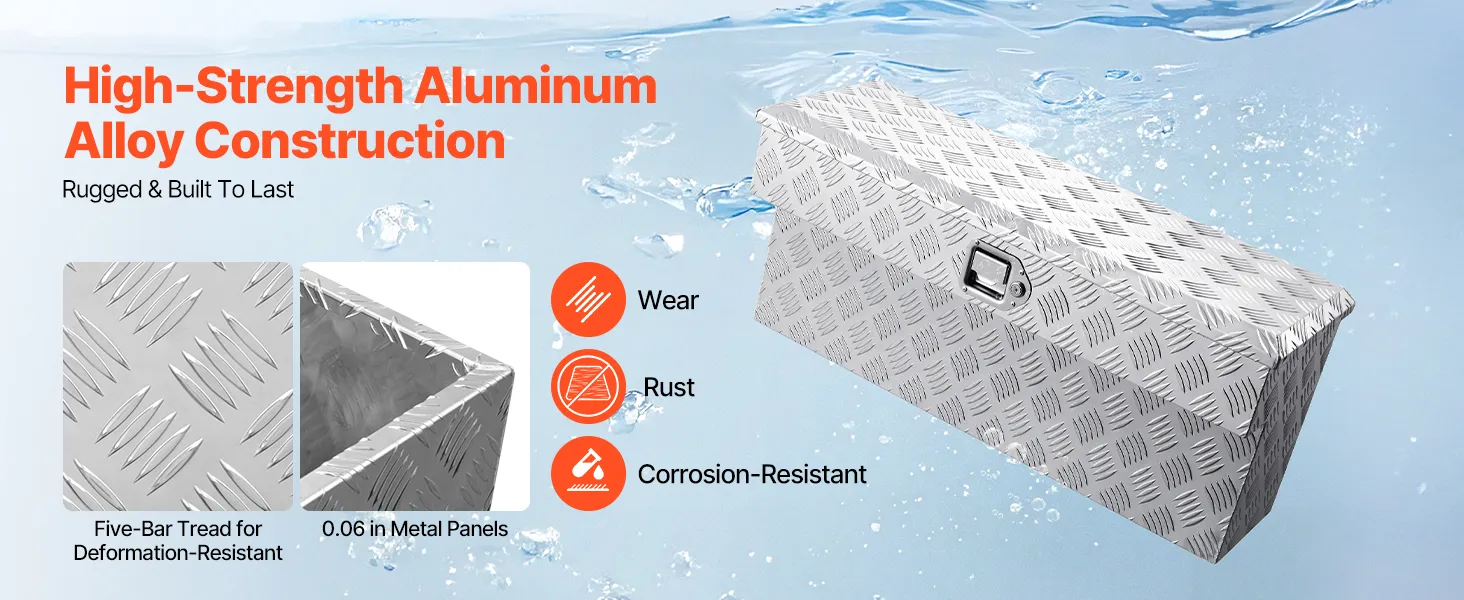 Skrzynka narzędziowa VEVOR do skrzyni ładunkowej ciężarówki, aluminiowa skrzynia do przechowywania z wzorem profilowym, organizer do przechowywania z zamkiem i kluczem, idealna do ciężarówek, pickupów, kamperów, przyczep, 864 x 305 x 390 mm