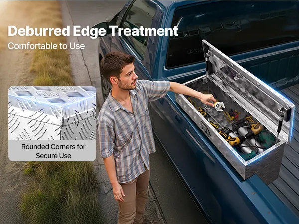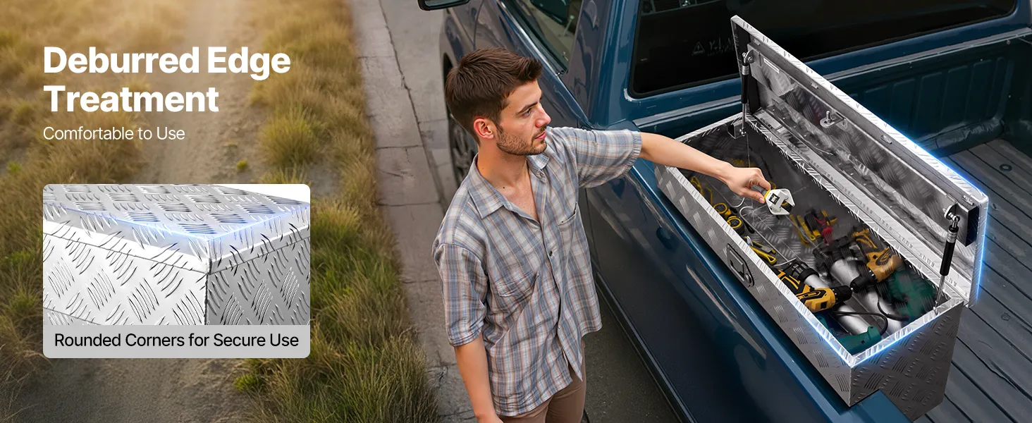 Podwójnie uszczelniona ochrona: Dzięki bezszwowym spawom i zintegrowanym gumowym uszczelkom, ta skrzynia narzędziowa do samochodów ciężarowych oferuje podwójną ochronę. Nawet w deszczu i wilgotnych warunkach narzędzia pozostają suche i czyste, co zapobiega korozji i wydłuża ich żywotność.