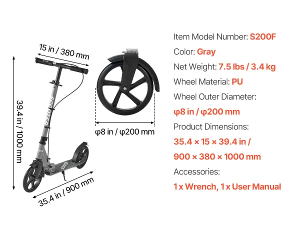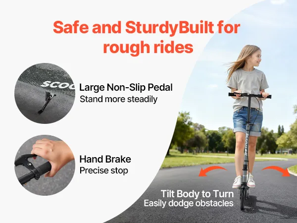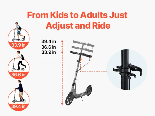 Regulacja wysokości: Regulowana kierownica z trzema ustawieniami wysokości: 33,9 / 36,6 / 39,4 cala (860/930/1000 mm). Ta hulajnoga dla dzieci rośnie wraz z dzieckiem i pasuje nawet do dorosłych – nie wymaga częstej wymiany.