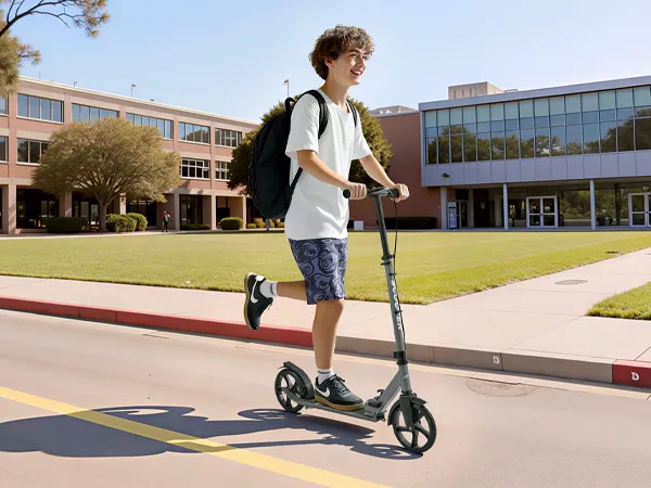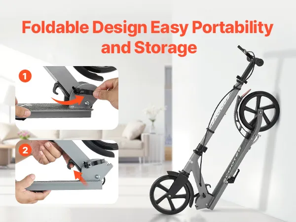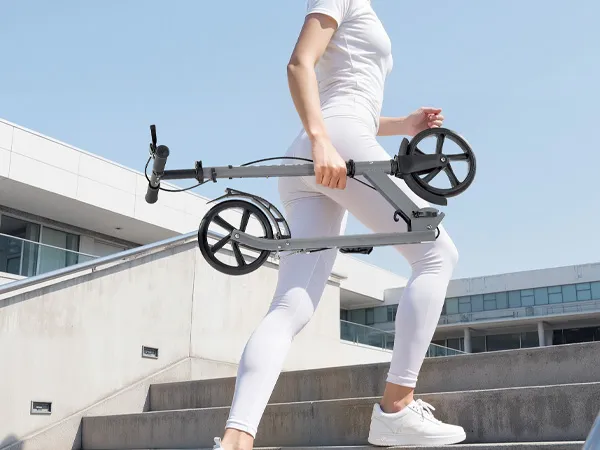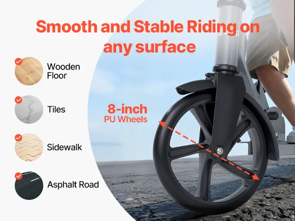 8-calowe koła amortyzujące: Dzięki wysoce elastycznym kołom poliuretanowym ta hulajnoga uliczna oferuje płynniejszą i bardziej stabilną jazdę. Z łatwością sunie po asfalcie, chodnikach, drewnianych podłogach i płytkach, redukując wstrząsy i hałas.