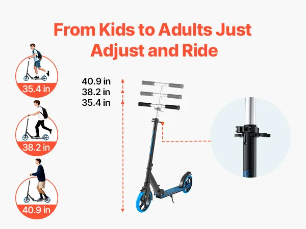 Regulacja wysokości: Regulowana kierownica z trzema ustawieniami wysokości: 35,4/38,2/40,9 cala (900/970/1040 mm). Hulajnoga rośnie wraz z dzieckiem i pasuje nawet do dorosłych – nie wymaga częstej wymiany.