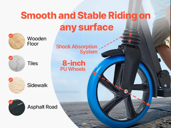 8-calowe koła z amortyzacją: Dzięki wysoce elastycznym kołom poliuretanowym i systemowi amortyzacji, ta hulajnoga dla dzieci zapewnia płynniejszą i bardziej stabilną jazdę. Z łatwością sunie po asfalcie, chodnikach, drewnianych podłogach i płytkach, redukując wstrząsy i hałas.
