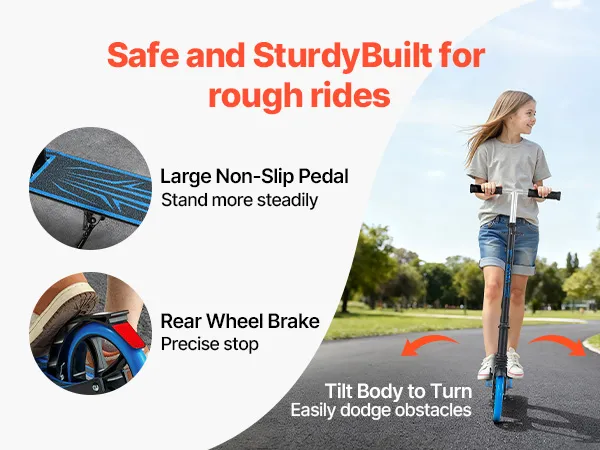 Bezpieczna jazda i możliwość składania: Szeroki, antypoślizgowy podnóżek hulajnogi zapewnia lepszą stabilność. Tylny hamulec nożny umożliwia łatwe i kontrolowane zatrzymywanie. Hulajnoga składa się szybko i jest lekka – łatwa do przenoszenia lub przechowywania w bagażniku samochodu.