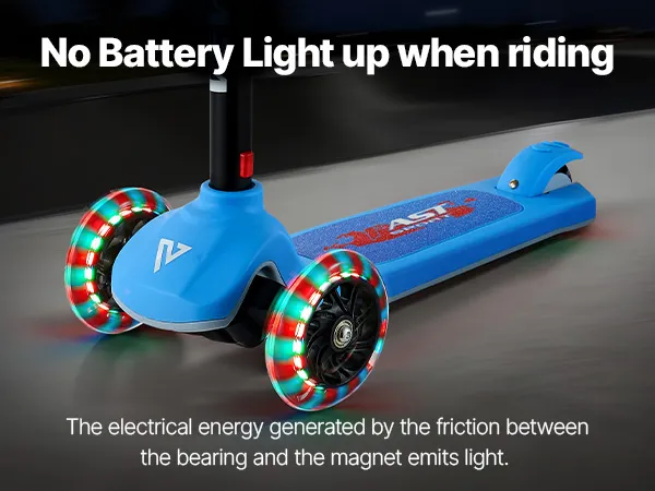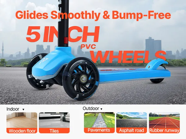 5-calowe podświetlane koła: Koła hulajnogi zapalają się automatycznie podczas jazdy – bez baterii! Dla większej frajdy i widoczności podczas nocnych przejażdżek. Duże, 5-calowe koła płynnie suną po chodnikach, asfalcie, drewnianych podłogach i płytkach, minimalizując wstrząsy i hałas.