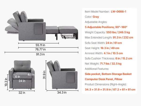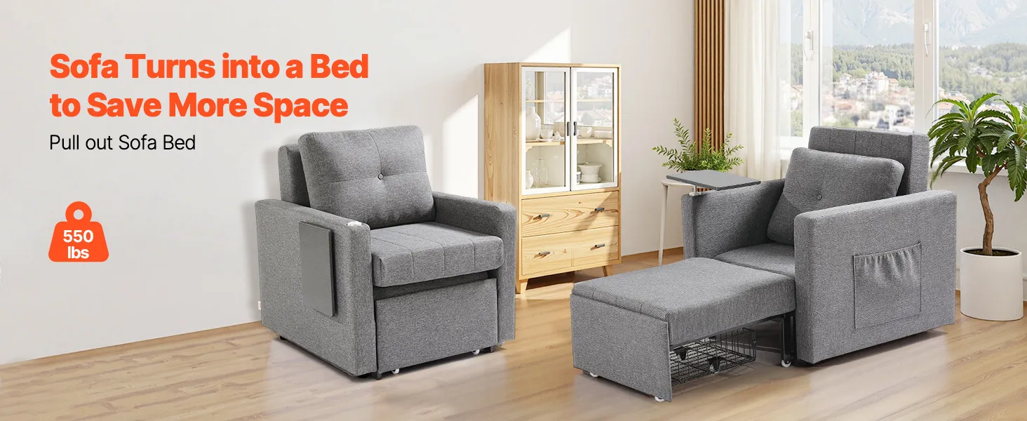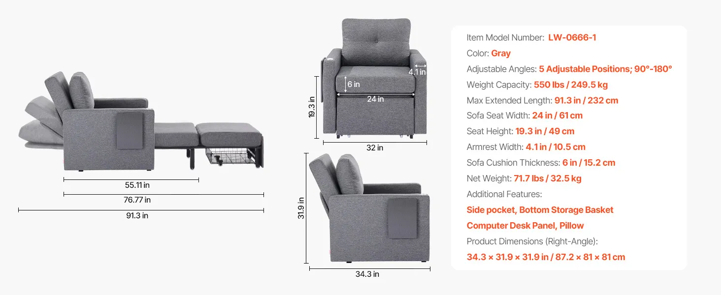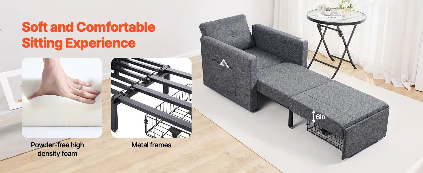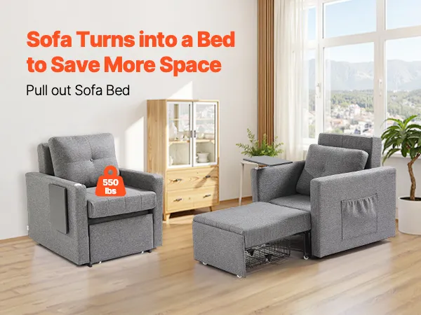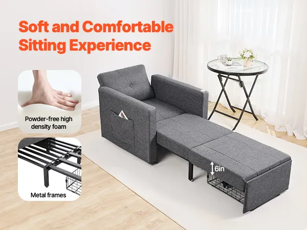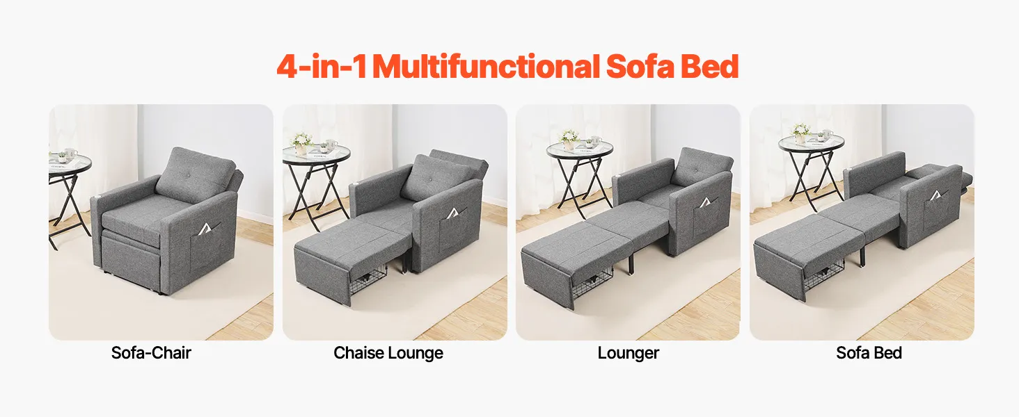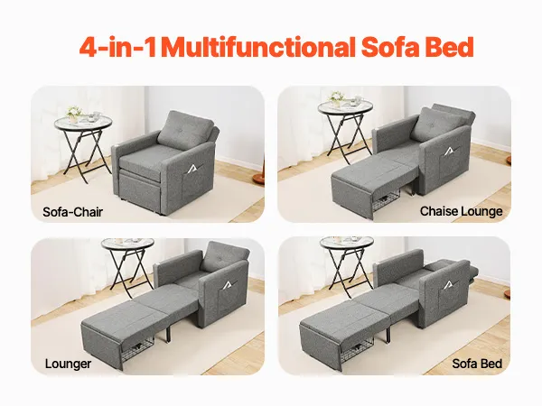 Wielofunkcyjna sofa z funkcją spania: Tę sofę z funkcją spania można z łatwością przekształcić w fotel, fotel rozkładany lub łóżko. Jest idealna na każdą okazję. Niezależnie od tego, czy chcesz się odprężyć, aby poczytać, obejrzeć film czy zaoferować gościom tymczasowe miejsce do spania, wszechstronna konstrukcja pozwala zaoszczędzić miejsce i zwiększa funkcjonalność domu
