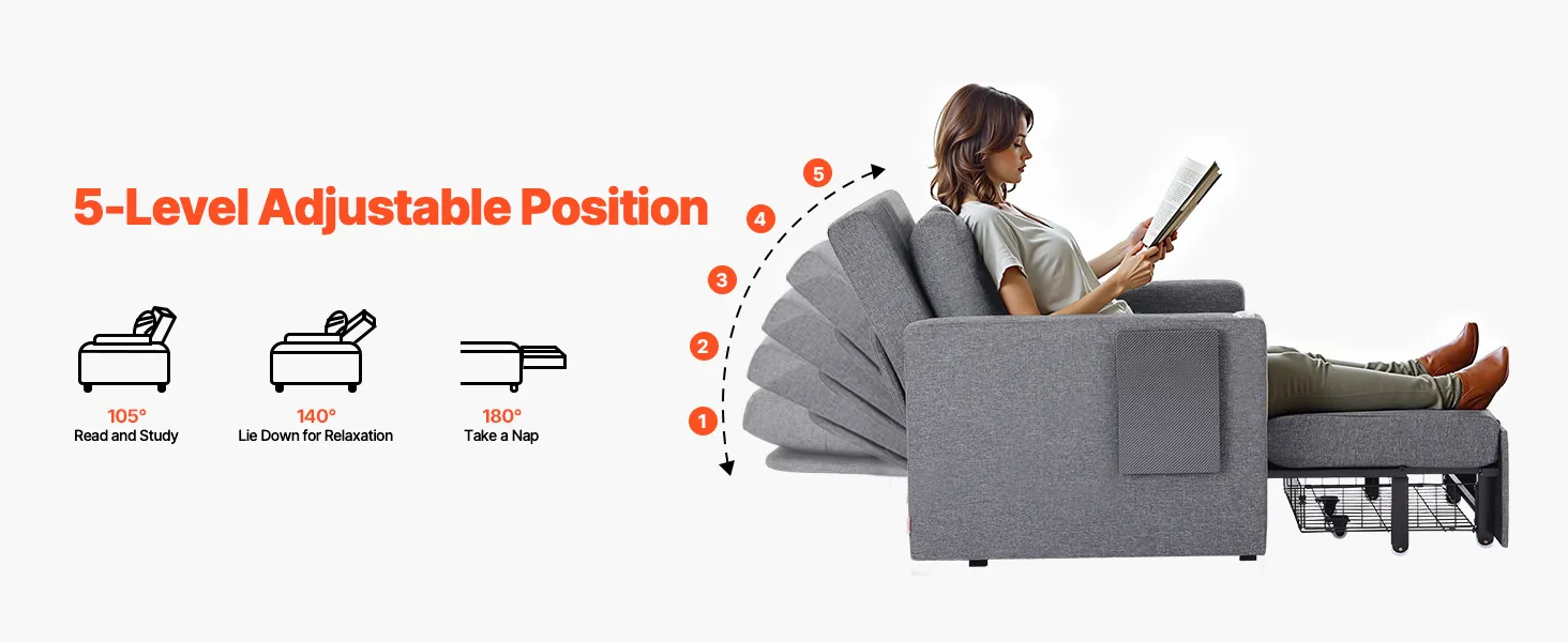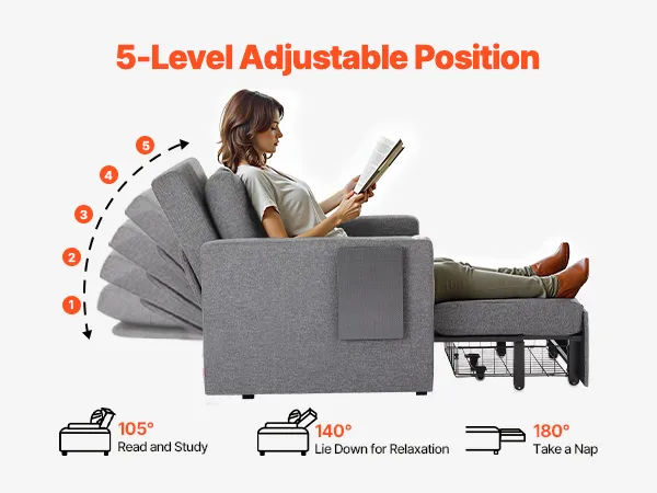 Regulowane oparcie: Dzięki 5 pozycjom odchylenia od 90° do 180° z łatwością znajdziesz najwygodniejszą pozycję. Sofa rozkłada się do długości 91,3 cala (232 cm), więc nie musisz się już martwić o ciasne nogi!