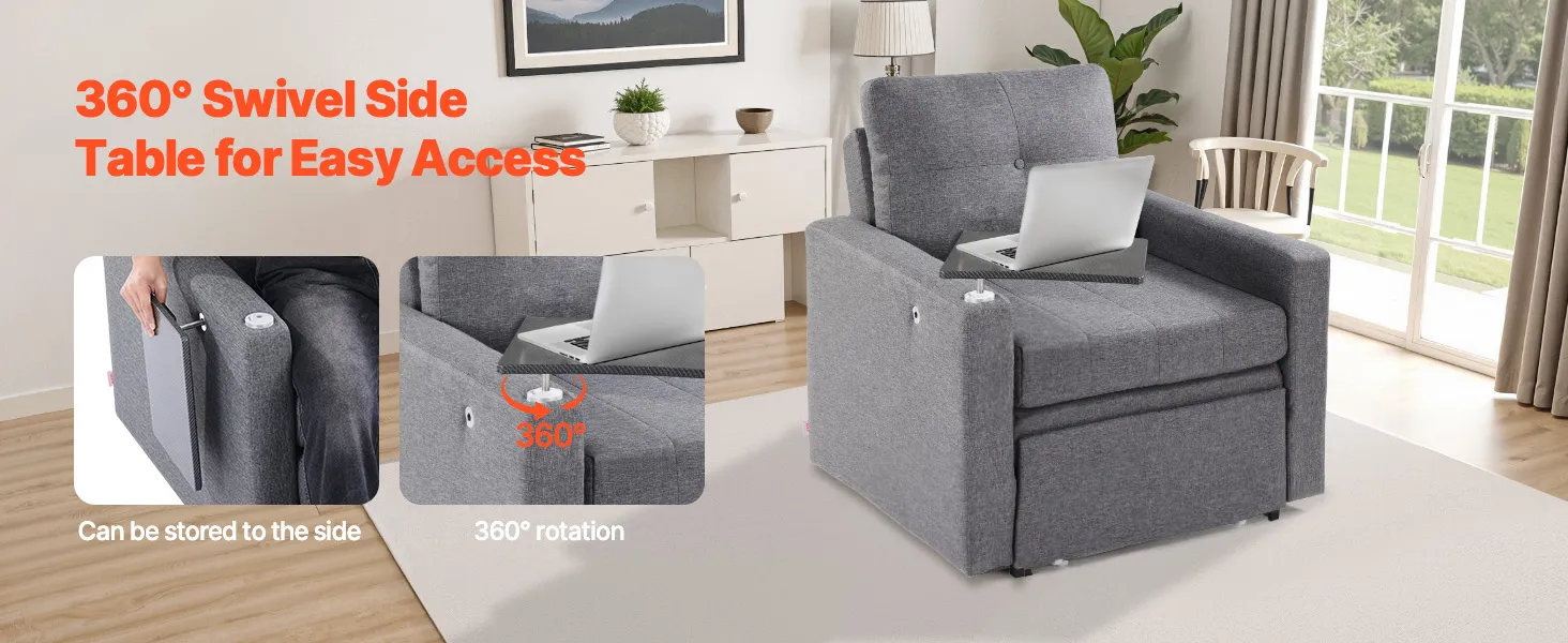 Sofa rozkładana VEVOR z kieszenią boczną, poduszką i podłokietnikiem, fotel rozkładany z oparciem regulowanym w 5 kierunkach, rozkładana sofa z 2 kółkami i schowkiem pod spodem, kolor szary