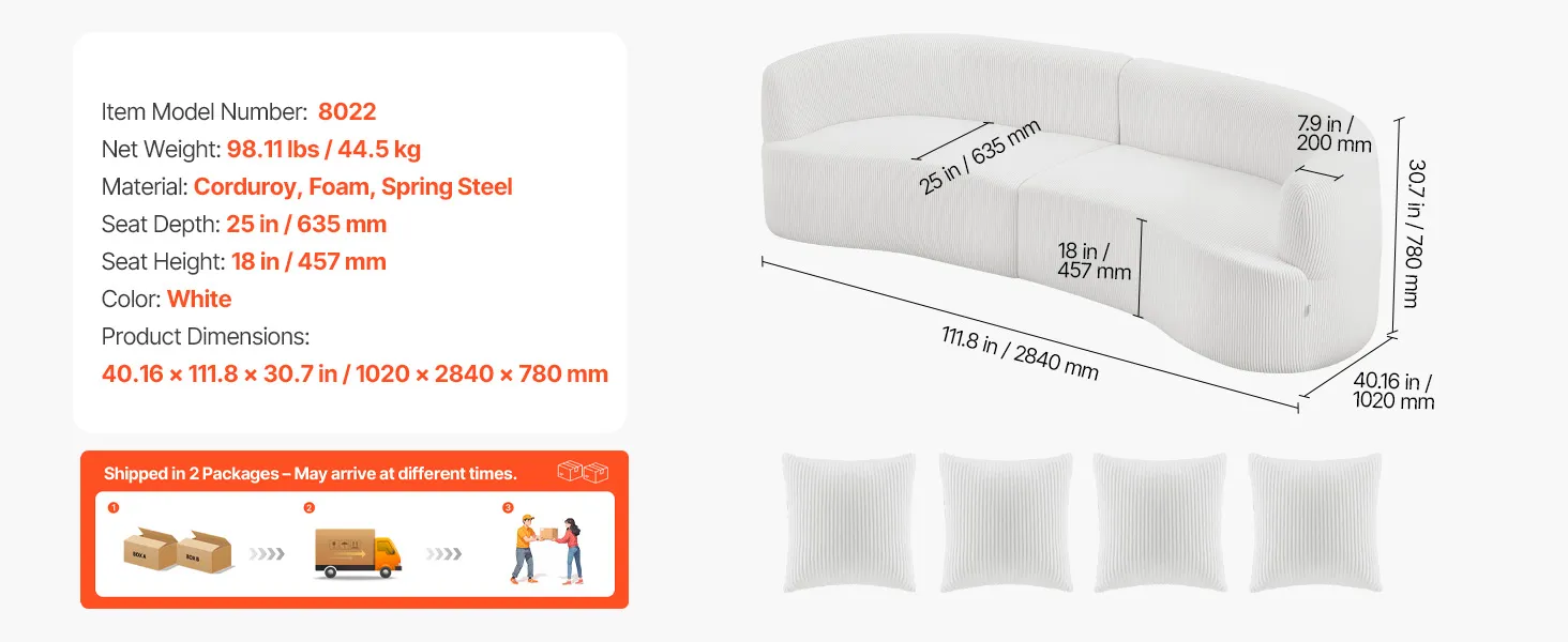 Nie wymaga montażu: Dzięki kartonowemu opakowaniu, ta zakrzywiona sofa jest łatwa w transporcie i przenoszeniu. Do transportu potrzebne są tylko dwie osoby. Po rozpakowaniu i pozostawieniu na 48–72 godziny powróci do pierwotnego kształtu bez konieczności skomplikowanego montażu.