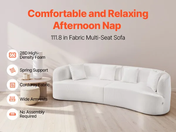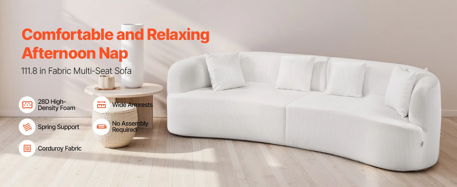 Ta sofa o długości 284 cm wyposażona jest w piankę o wysokiej gęstości 28D i system sprężyn zapewniający wyjątkowy komfort i wsparcie. Przyjazna dla skóry, oddychająca tkanina sztruksowa i szerokie podłokietniki zapewniają miękkość i wygodę. Ponieważ montaż nie jest wymagany, wystarczy rozpakować i pozostawić na 48–72 godziny.