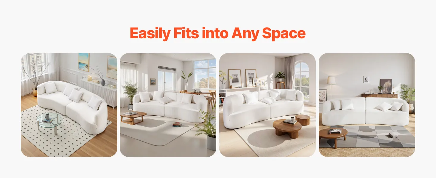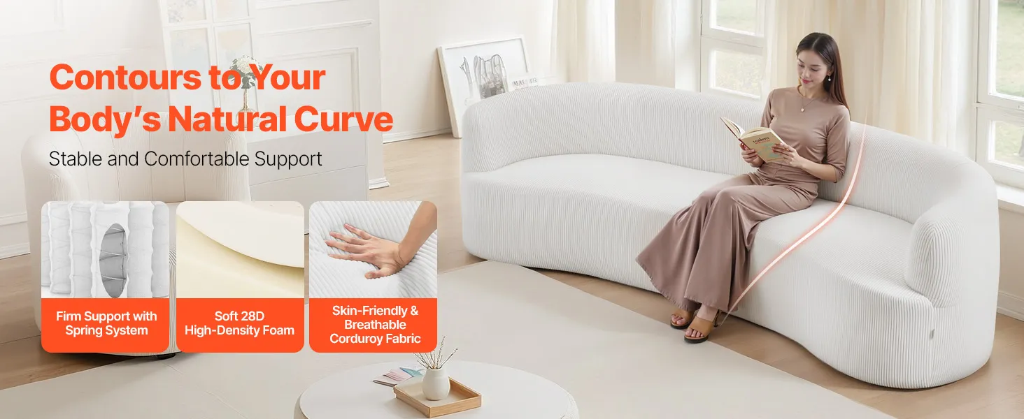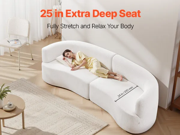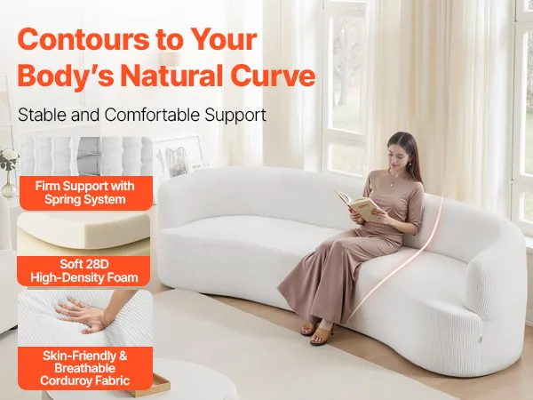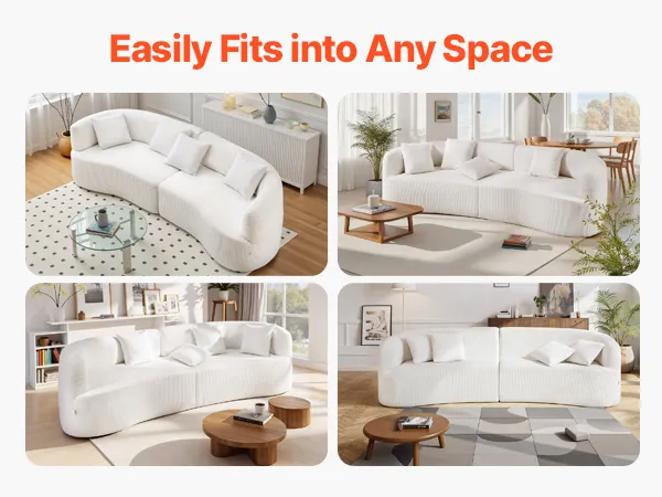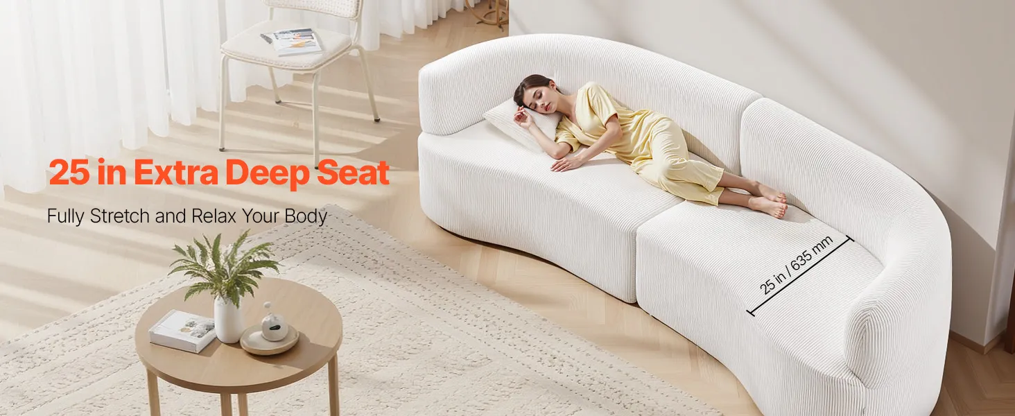 Bardzo długa strefa wypoczynkowa: Ta wyjątkowo długa, zakrzywiona sofa o długości 284 cm (111,8 cala) wygodnie pomieści trzy osoby, nie czując się przy tym ciasno. Niezależnie od tego, czy chodzi o spotkania rodzinne, czy wizyty u znajomych, oferuje wygodną i przestronną strefę relaksu.