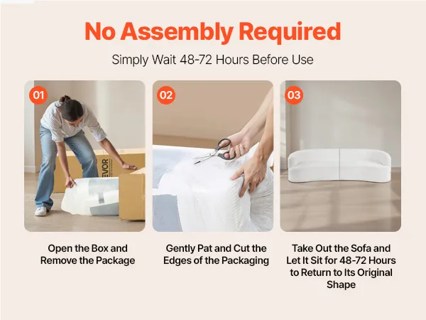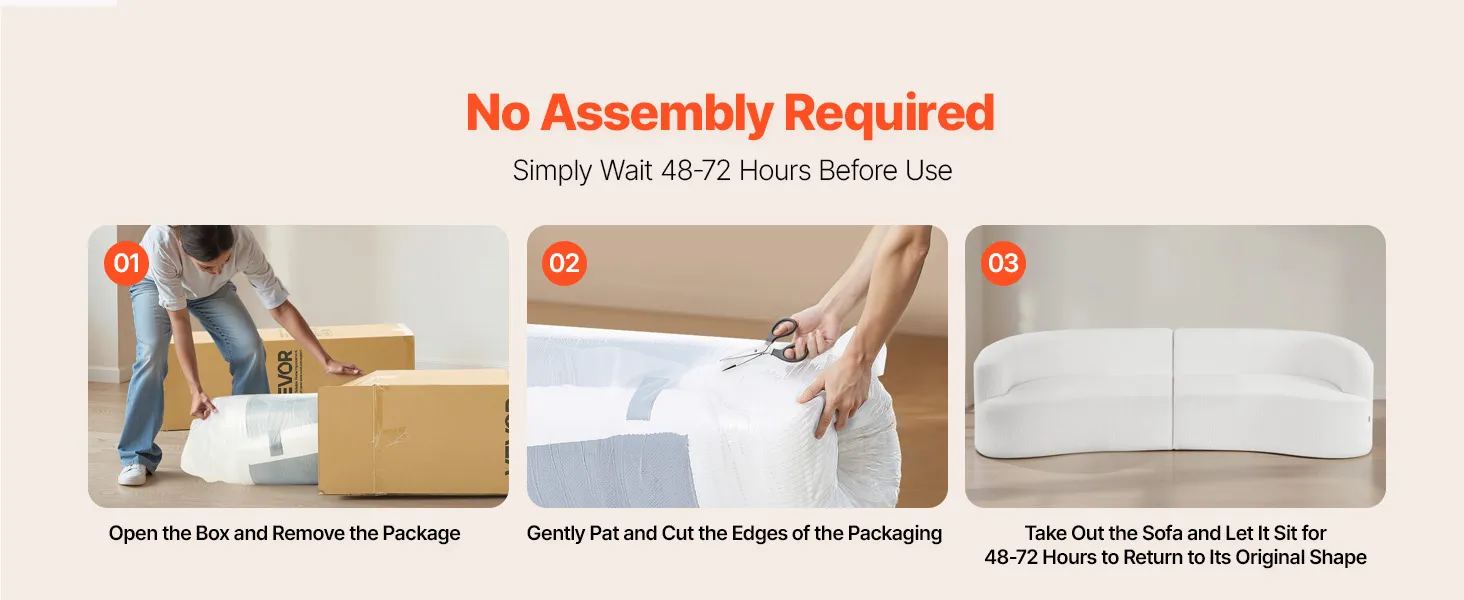 Ta zakrzywiona, modułowa sofa została zaprojektowana z myślą o łatwości użytkowania i nie wymaga montażu. Wystarczy rozpakować, delikatnie wstrząsnąć i pozostawić na 48–72 godziny przed użyciem.