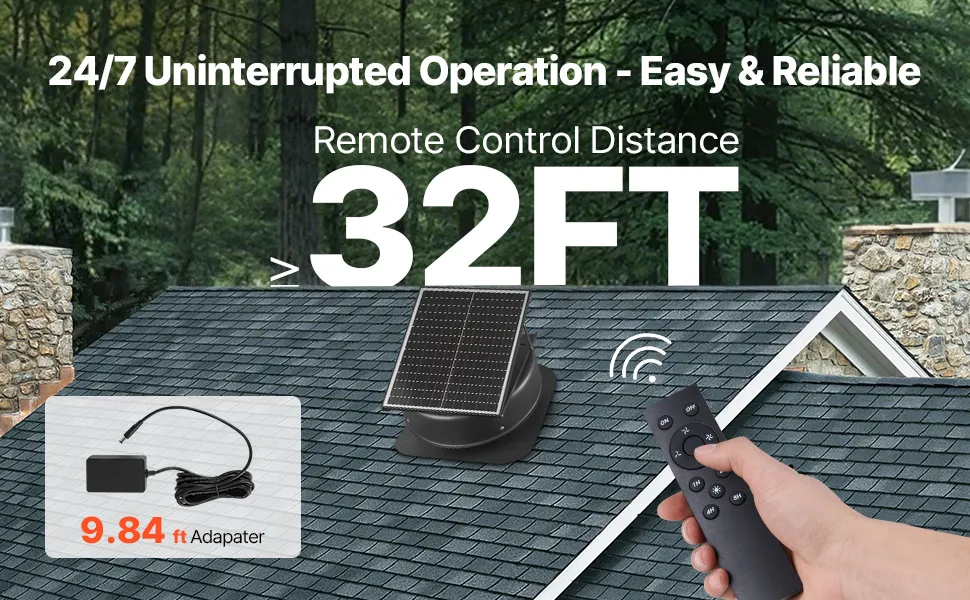 Jeżeli energia słoneczna okaże się niewystarczająca, inteligentny zasilacz automatycznie uzupełni baterię, zapewniając pracę wentylatora 24 godziny na dobę, 7 dni w tygodniu. Dzięki bezprzewodowemu pilotowi można wygodnie włączać i wyłączać wentylator z odległości.