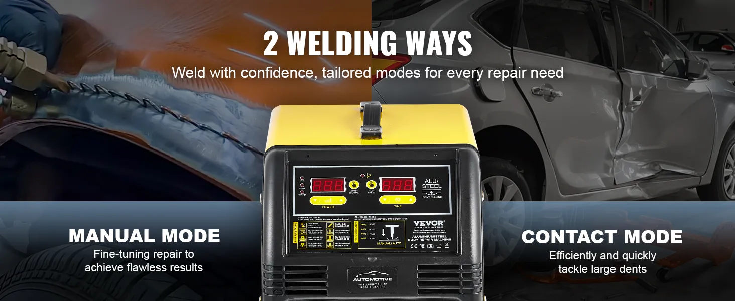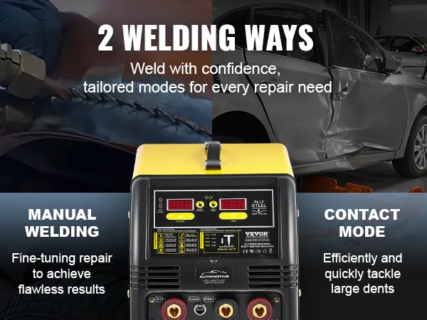 Dzięki dużej mocy wyjściowej 5 kW, automatycznym/ręcznym trybom spawania i dwóm pistoletom spawalniczym spawarka VEVOR Dual Pro Stud Welder stanowi kompletne rozwiązanie do spawania stalowych i aluminiowych paneli samochodowych. 10 trybów spawania zaspokaja szeroki zakres potrzeb naprawczych.