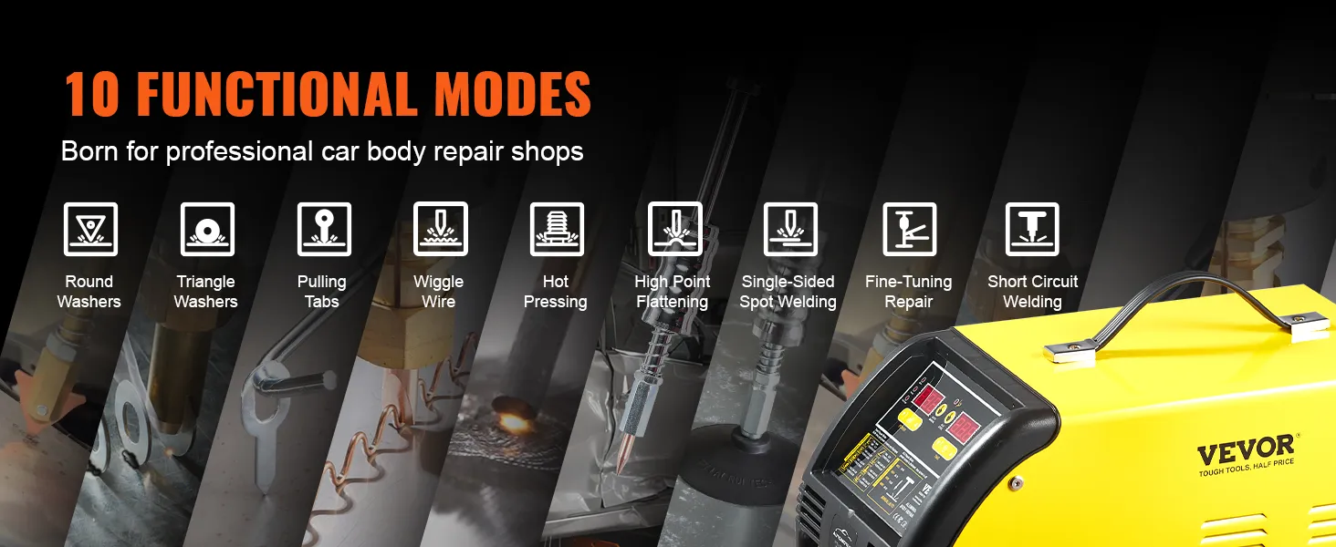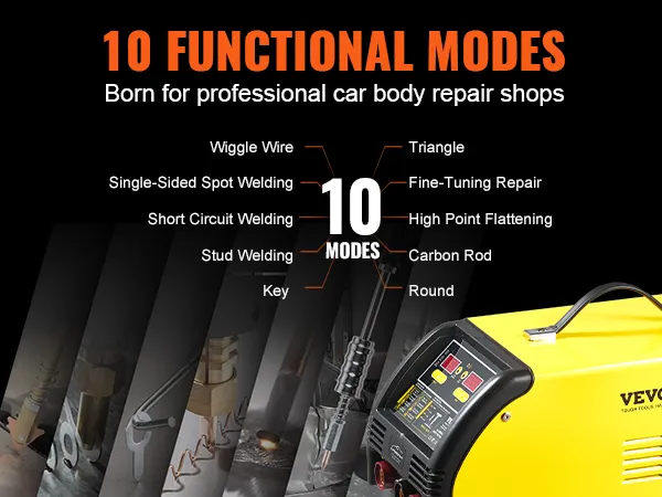 Spawarka-usuwacz wgnieceń VEVOR ma 10 trybów pracy, w tym: precyzyjną naprawę, spłaszczanie punktowe, pręt węglowy, trójkątny, okrągły, OT, drut falisty, jednostronne spawanie punktowe, spawanie kołków i spawanie zwarciowe.