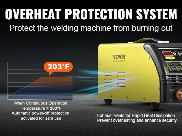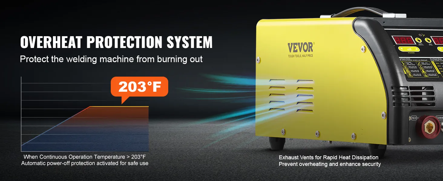 Nasza zgrzewarka punktowa wyposażona jest w inteligentny system ochrony przed przegrzaniem, który uruchamia się, gdy temperatura przekroczy 203°F, zapobiegając zwarciom i uszkodzeniom maszyny.