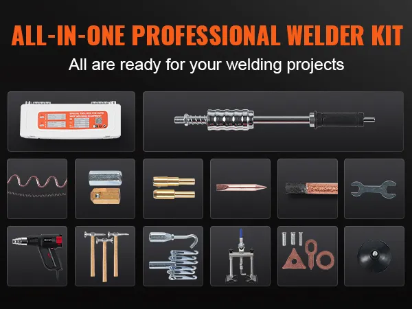 Kompleksowe akcesoria: Zawiera pełen zestaw narzędzi i akcesoriów, takich jak śruby, podkładki, ściągacze, młotki ślizgowe, młotki aluminiowe i opalarki. Kompletny zestaw do usuwania wgnieceń VEVOR poradzi sobie ze wszystkim, od małych wgnieceń po większe wgniecenia na płaskich lub zakrzywionych panelach nadwozia.