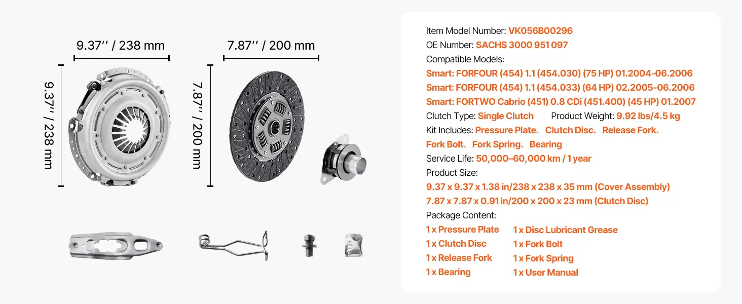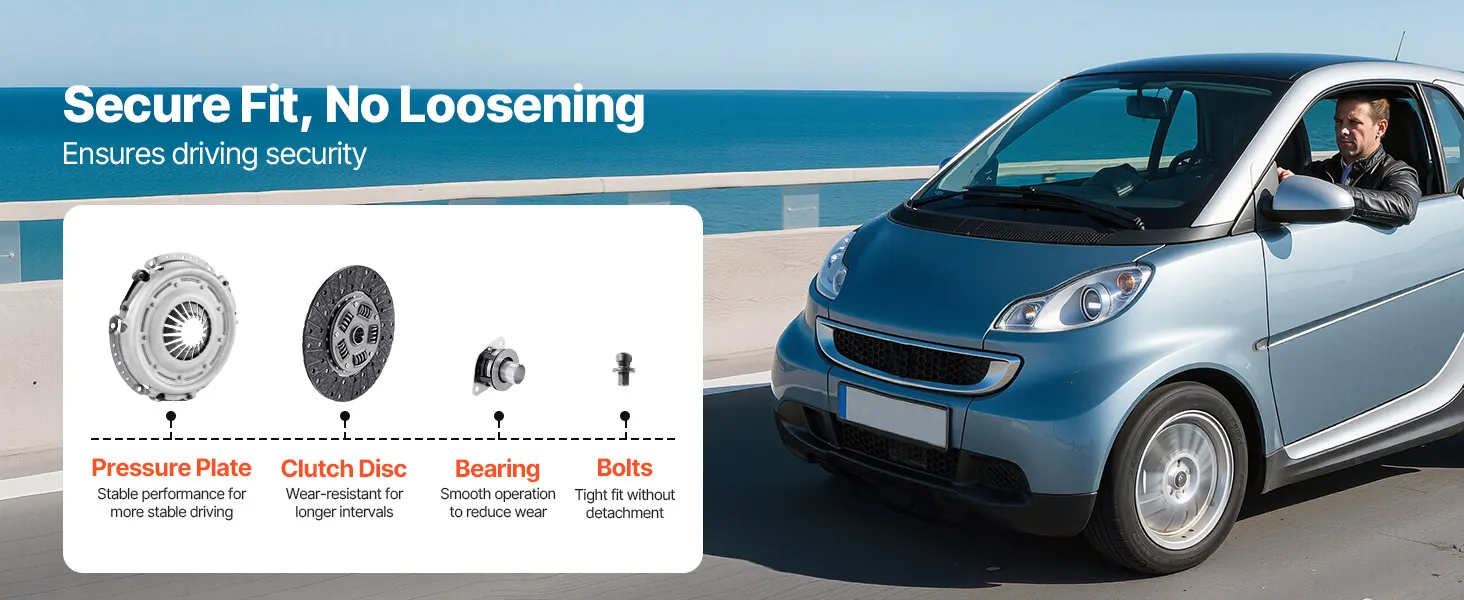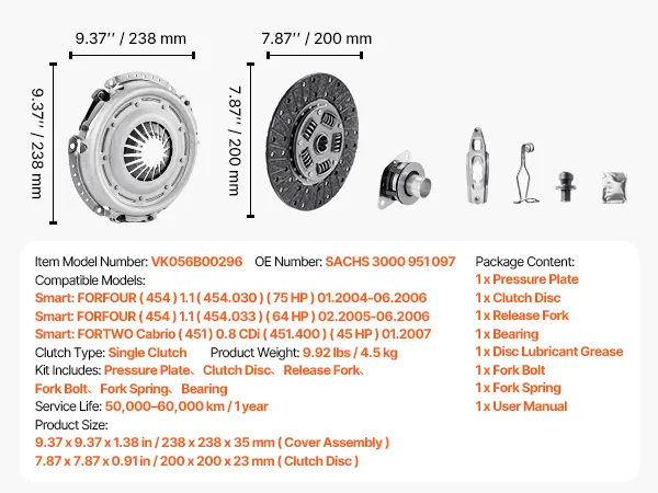 Zestaw sprzęgła VEVOR z tarczą dociskową, oryginalny zestaw sprzęgła skrzyni biegów, kompatybilny z modelami Smart FORFOUR (75 KM) z lat 2004-2006, FORFOUR (64 KM) z lat 2005-2006, FORTWO Cabrio z 2007 roku