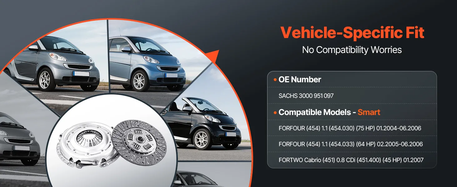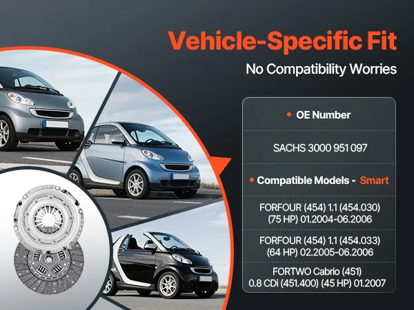 Dopasowanie do konkretnego pojazdu: Numer OE: SACHS 3000 951 097. Nasz zestaw sprzęgła pasuje do następujących modeli samochodów Smart: FORFOUR (454) 1.1 (454.030) (75 KM) 01.2004-06.2006, FORFOUR (454) 1.1 (454.033) (64 KM) 02.2005-06.2006, FORTWO Cabrio (451) 0.8 CDi (451.400) (45 KM) 01.2007
