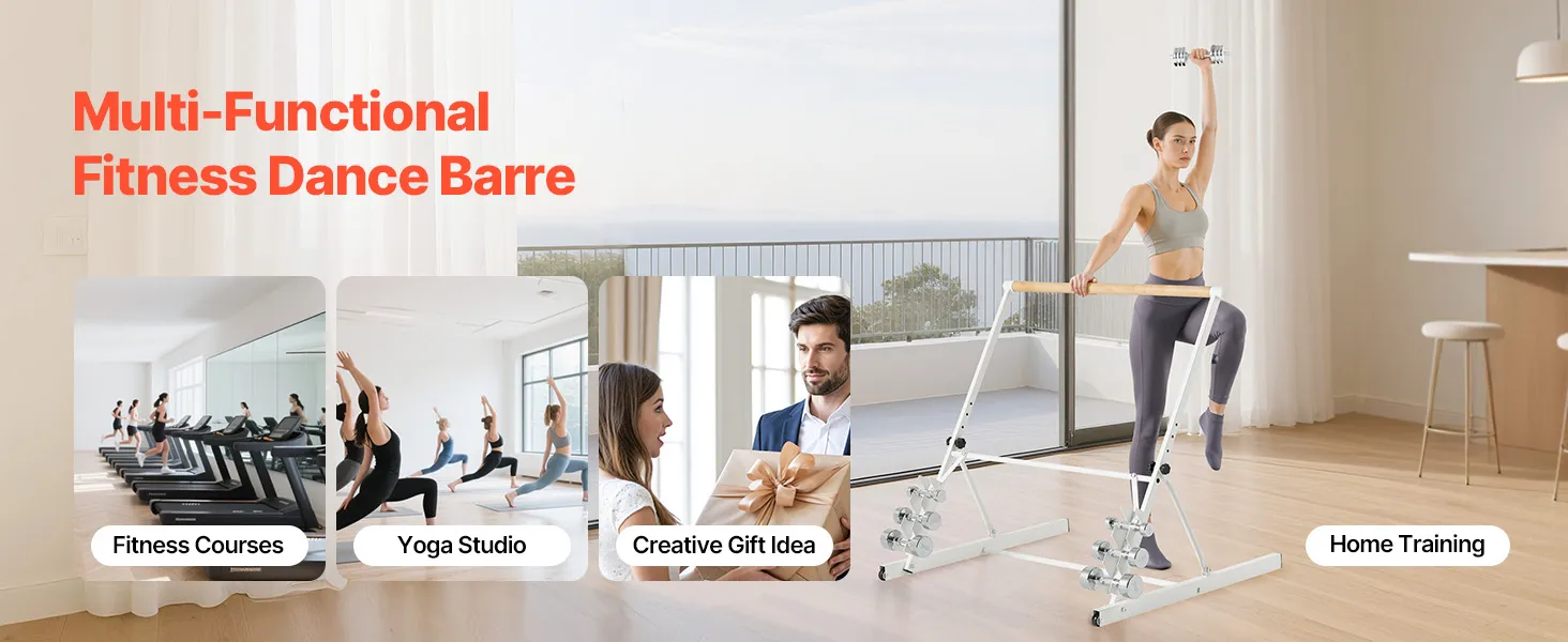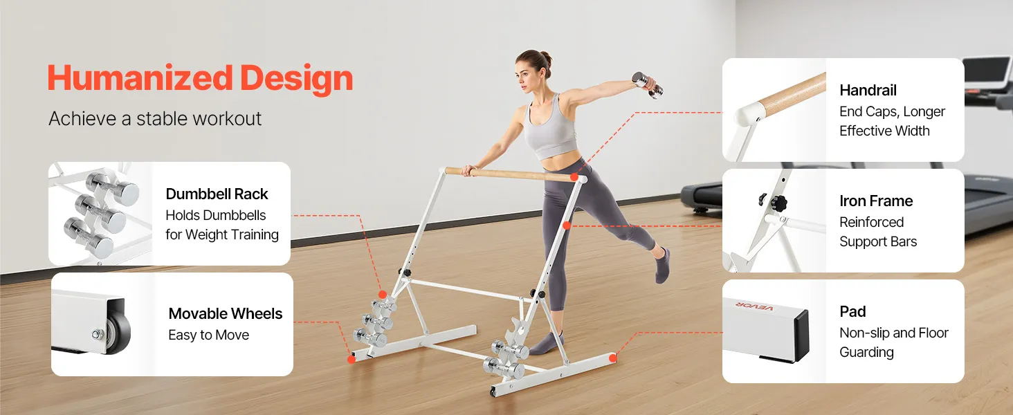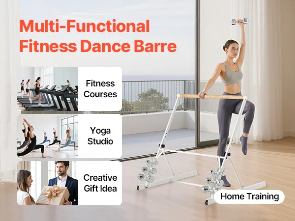 Wszechstronne możliwości treningowe: Drążek do tańca to idealne narzędzie do rozciągania i fitnessu, pozwalające ćwiczyć pozycje i asany. Nadaje się do pilatesu, jogi i treningu wytrzymałościowego. Wyjmowany stojak na hantle zwiększa jego funkcjonalność.