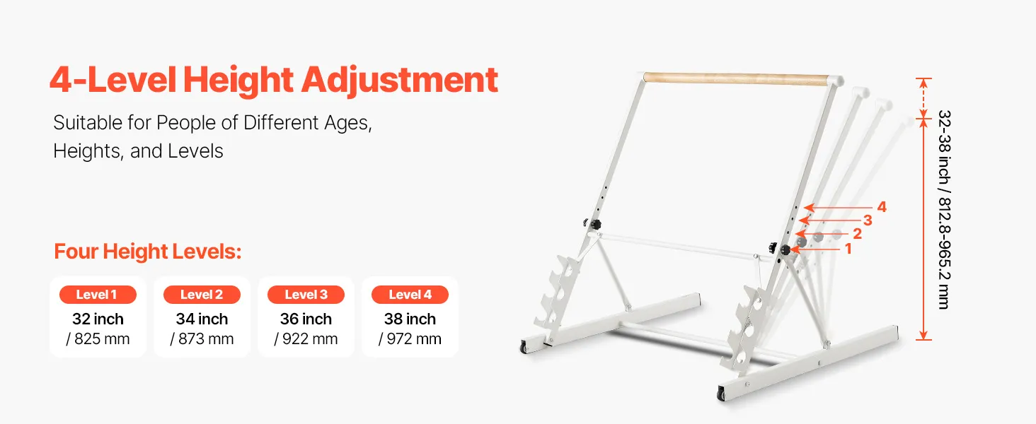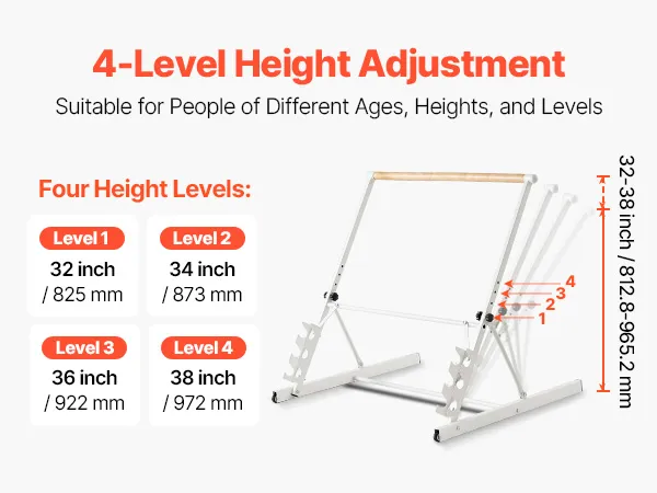 4-stopniowa regulacja wysokości: Regulowany kąt nachylenia z 4 ustawieniami wysokości, każde co 2 cale. Dostępne wysokości to 31,6/33,7/35,6/37,5 cala (802/855/905/953 mm). Ten przenośny drążek do tańca jest również wyposażony w boczny uchwyt blokujący, ułatwiający regulację wysokości.