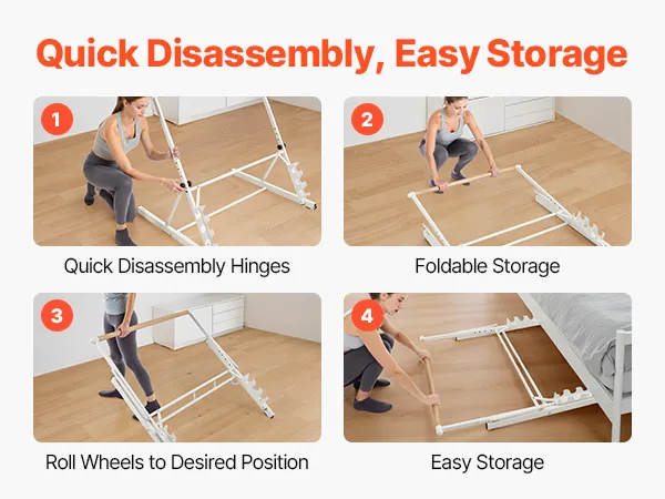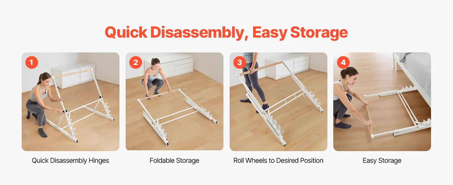 Łatwe składanie i przechowywanie: Dzięki zawiasowi z szybkim demontażem drążek składa się i rozkłada w kilka sekund. Z łatwością wsuwa się pod łóżko, sofę lub szafę. Dzięki zintegrowanym kółkom, wolnostojący drążek baletowy jest łatwy w przemieszczaniu.