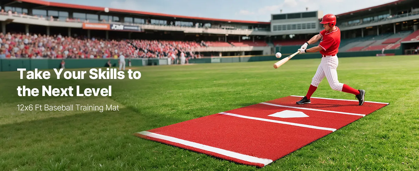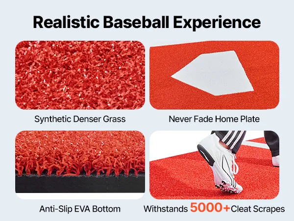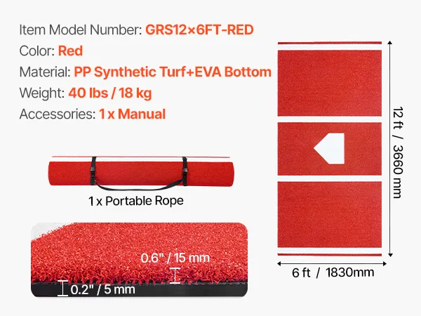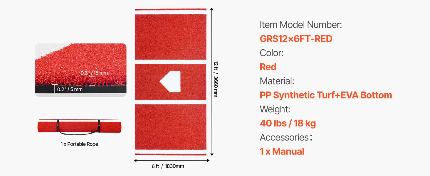 Mata treningowa do odbijania w baseballu VEVOR (366 x 183 cm), mata treningowa do klatki do odbijania, mata do baseballu z bazą domową i trawą odporną na blaknięcie, przenośna pomoc treningowa do softballu na zewnątrz, czerwona
