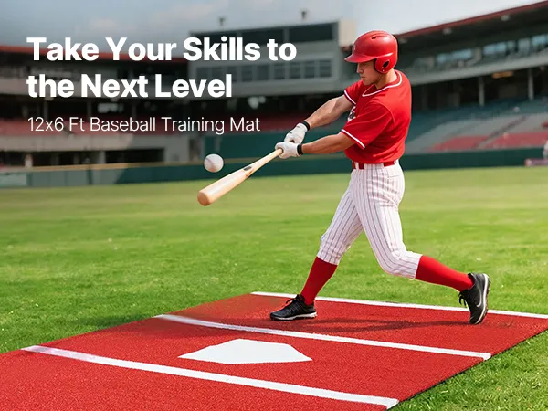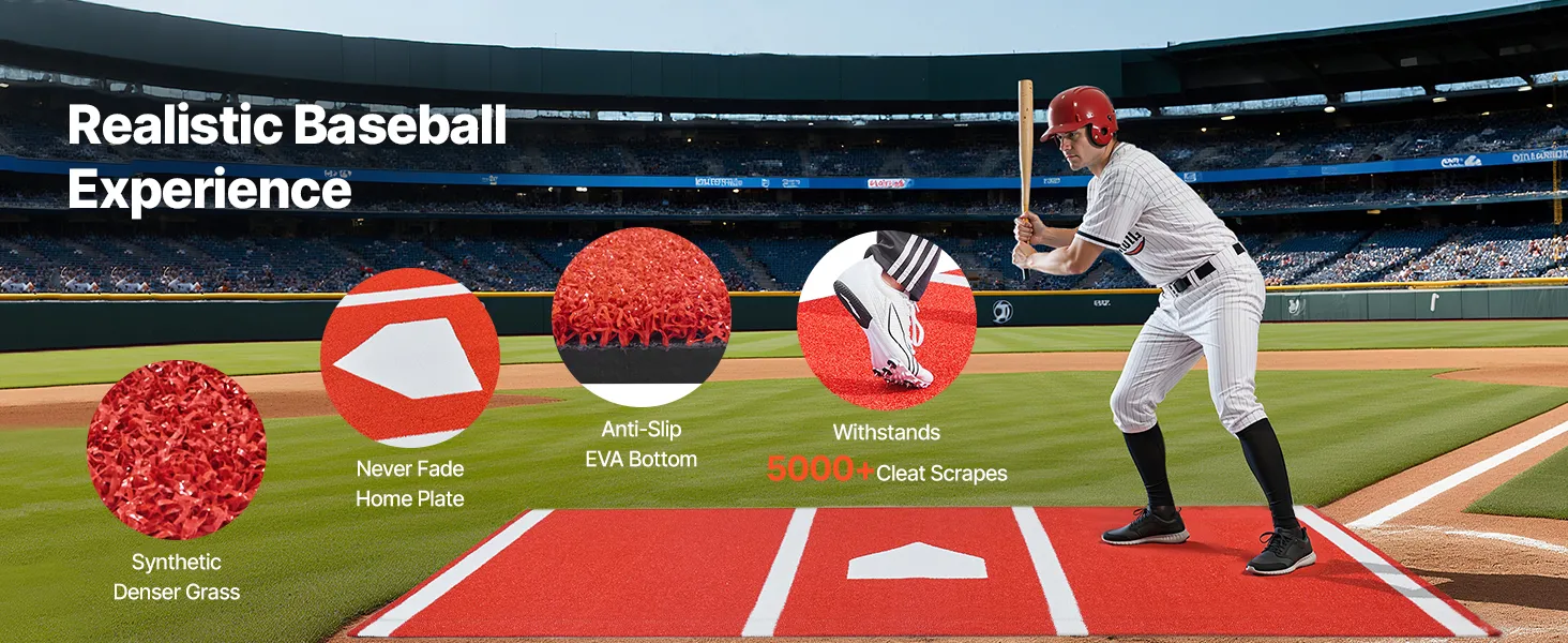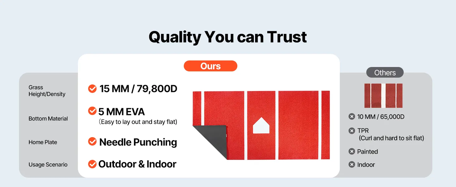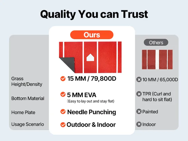 Nasza mata do baseballu jest wykonana z nowej sztucznej trawy. Wyższa i gęstsza konstrukcja zapewnia trwałość i jest odporna na odklejanie i blaknięcie. Jest niezwykle wytrzymała i można jej używać nawet z korkami lub butami z kolcami.