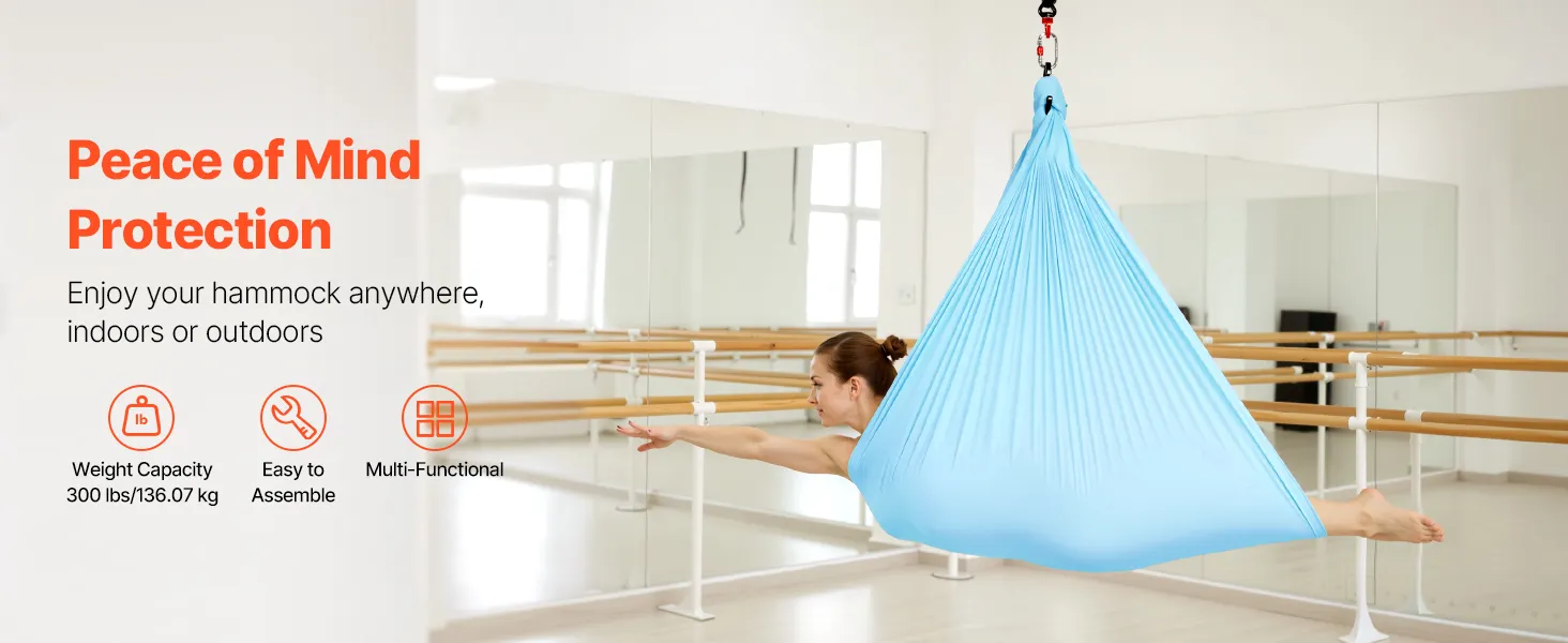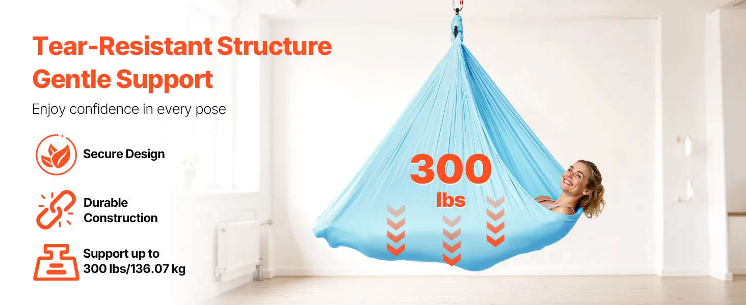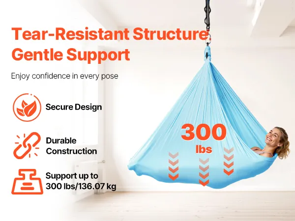 Dzięki mocnym stalowym karabińczykom i łańcuchom, ta jedwabna huśtawka do jogi wytrzymuje obciążenie 136,07 kg i pozwala na swobodne poruszanie się w pozycjach jogi. Jej szeroka konstrukcja jest odpowiednia dla każdego typu sylwetki, a przemyślana rama zapewnia komfort, swobodę ruchu i płynne, przyjemne ćwiczenia.