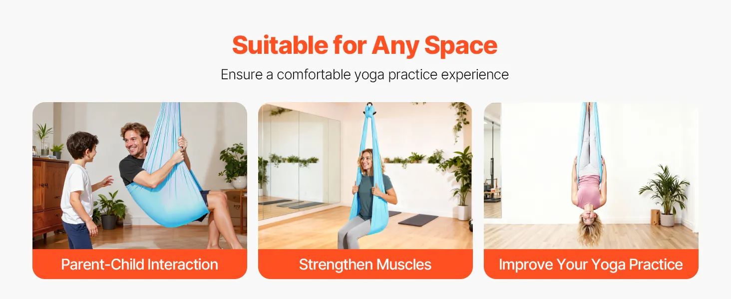 Konstrukcja huśtawki 360°: Ten jedwabny hamak do jogi o strukturze przypominającej kokon z obrotowym hakiem umożliwia huśtanie się w zakresie 360°, stymulując percepcję sensoryczną. Nadaje się do różnych wysokości sufitu i umożliwia szybkie przełączanie między trybem hamaka i huśtawki. Dzięki temu jogini mogą cieszyć się elastycznością i komfortem ćwiczeń w powietrzu.