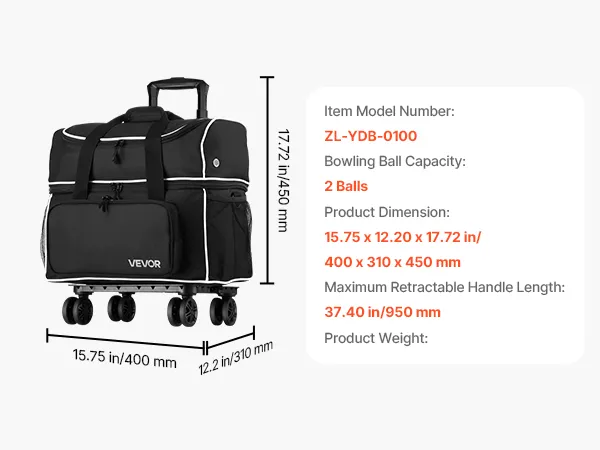Torba na kule do kręgli VEVOR na 2 kule z czterema kółkami i oddzielną przegrodą na buty (do rozmiaru US 16) oraz dużą kieszenią na akcesoria, wysuwana rączka, długość do 95 cm, kolor czarny